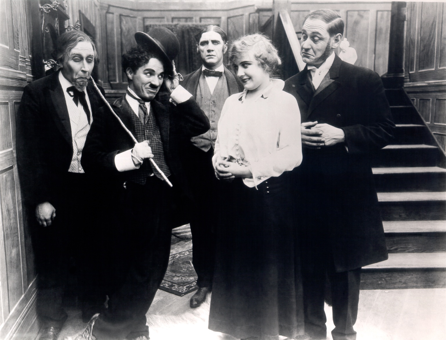 (L to R) Paddy McGuire, Charlie Chaplin, Lloyd Bacon, Edna Purviance, Ernest Van Pelt