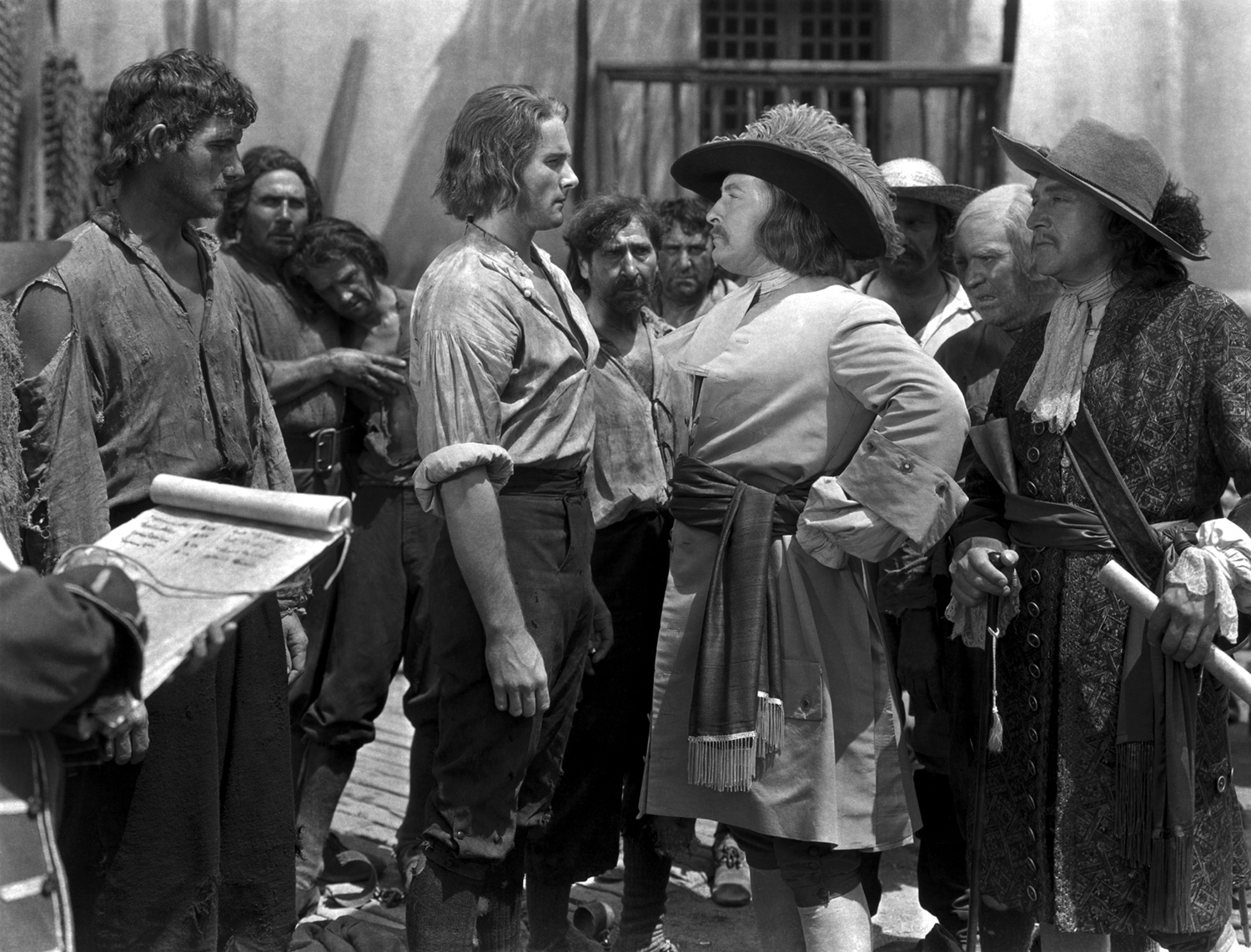 (L to R Foreground) Ian Hunter, Alan Hale Sr., Olivia de Havilland, Errol Flynn, Herbert Mundin, Patric Knowles, Eugene Pallette