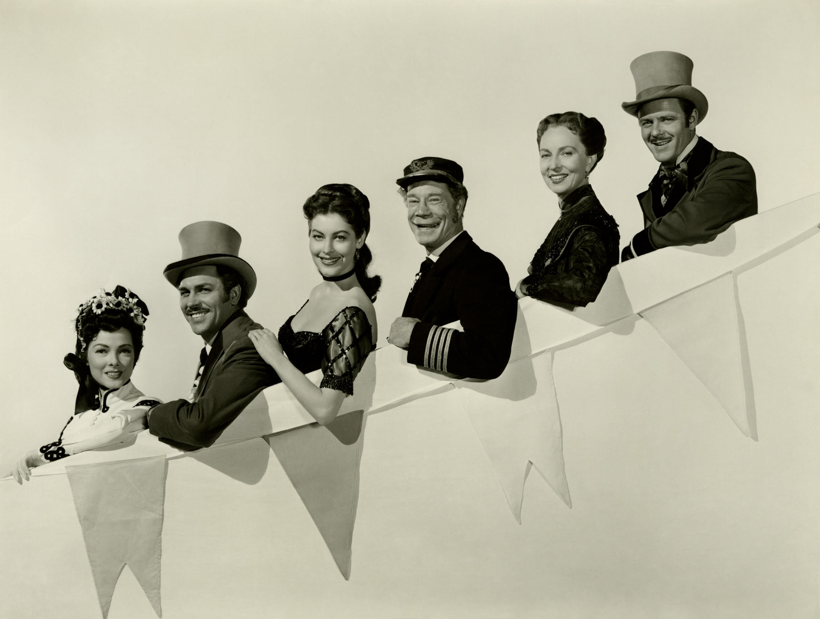 (L to R) Kathryn Grayson, Howard Keel, Ava Gardner. Joe E. Brown, Agnes Moorehead, Robert Sterling