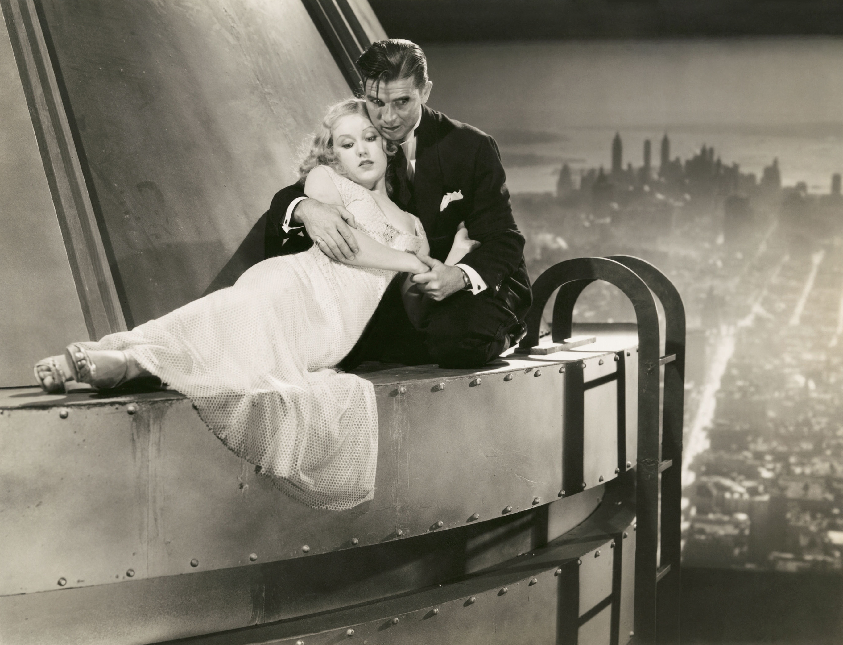 (L to R seated) Bruce Cabot, Fay Wray, Ernest B. Schoedsack (photo taken at a mockup of the dirigible mooring mast pinnacle of the Empire State Building)