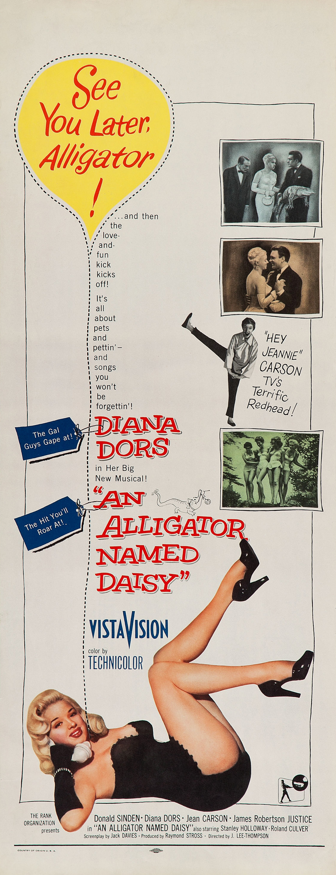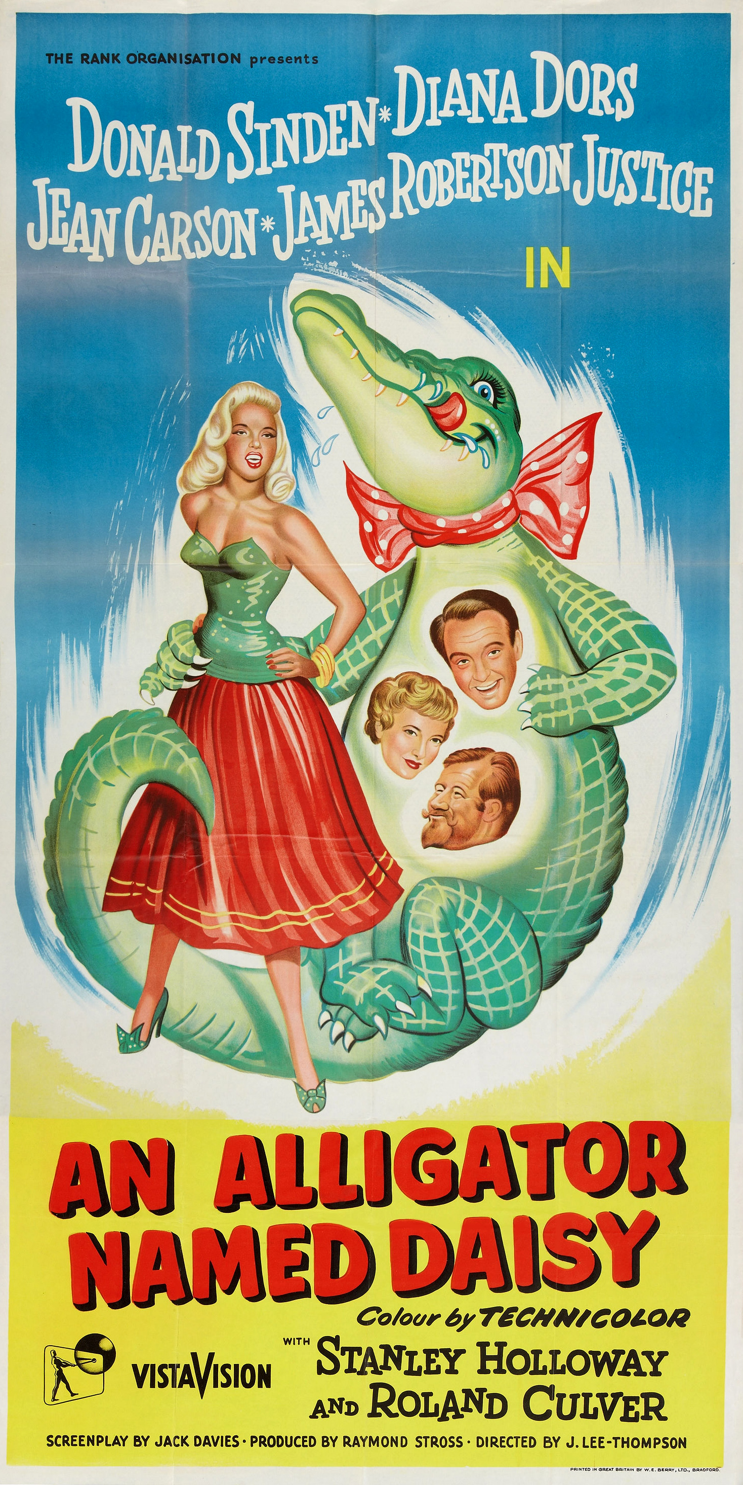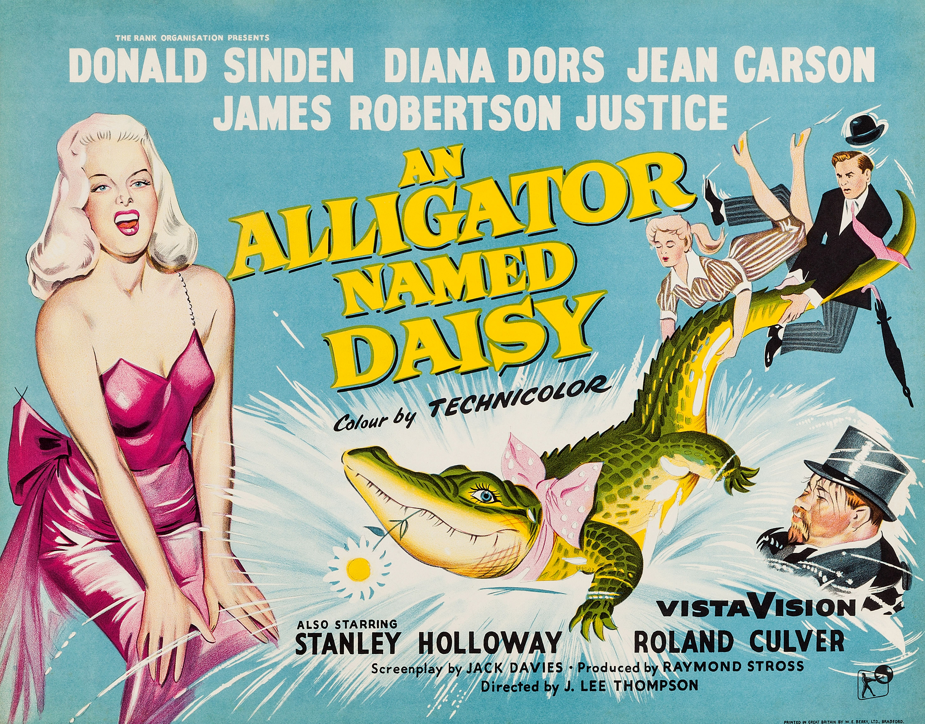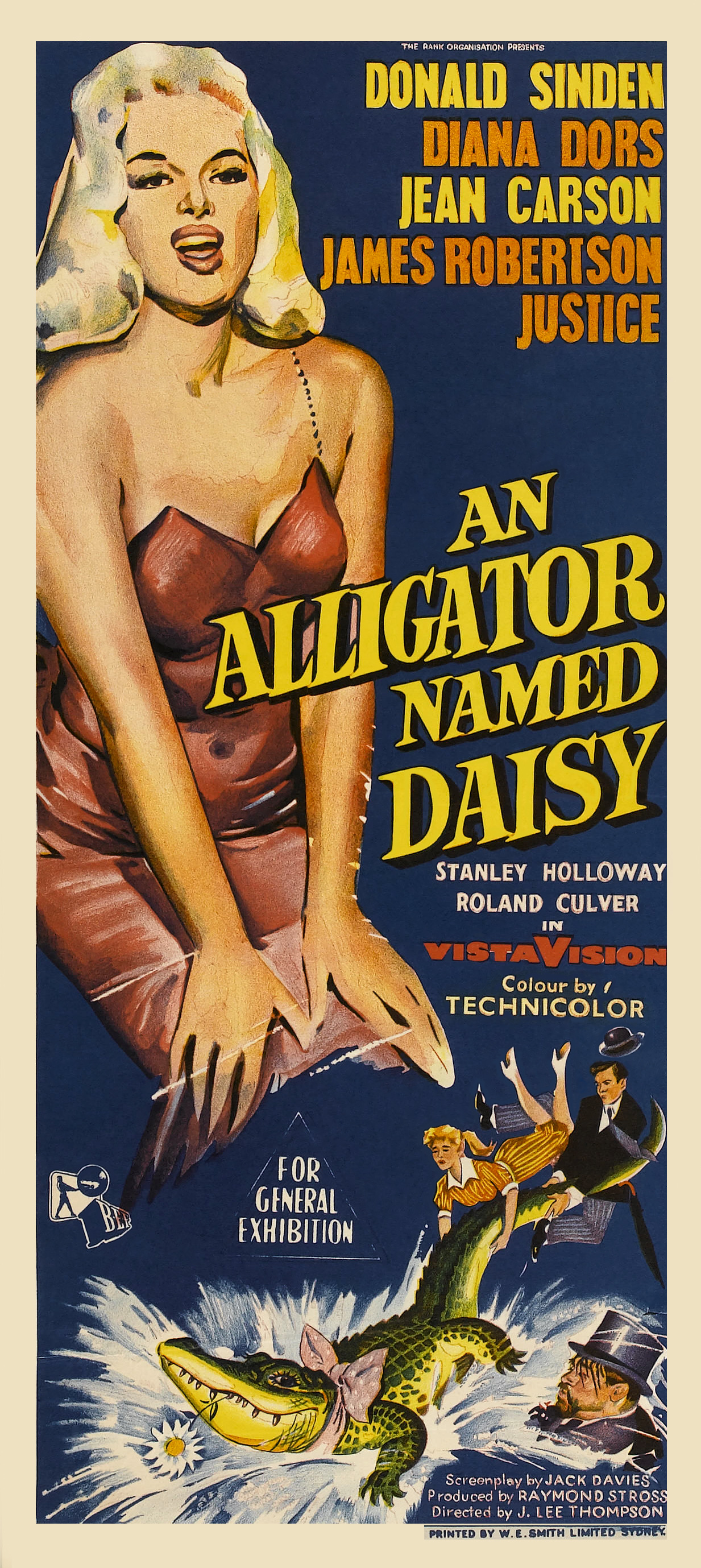 The Rank Organisation, 1955.  Directed by J. Lee Thompson.  Camera:  Reginald H. Wyer.  With Donald Sinden, Jeannie Carson, James Robertson Justice, Diana Dors, Roland Culver, Stanley Holloway, Avice Landone, Richard Wattis, Stephen Boyd, Ernest Thesiger, Henry Kendall, Michael Shepley, Wilfrid Lawson, Charles Victor, George Moon, Margaret Rutherford.