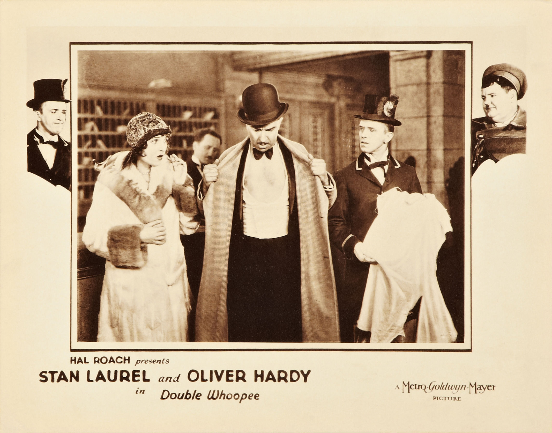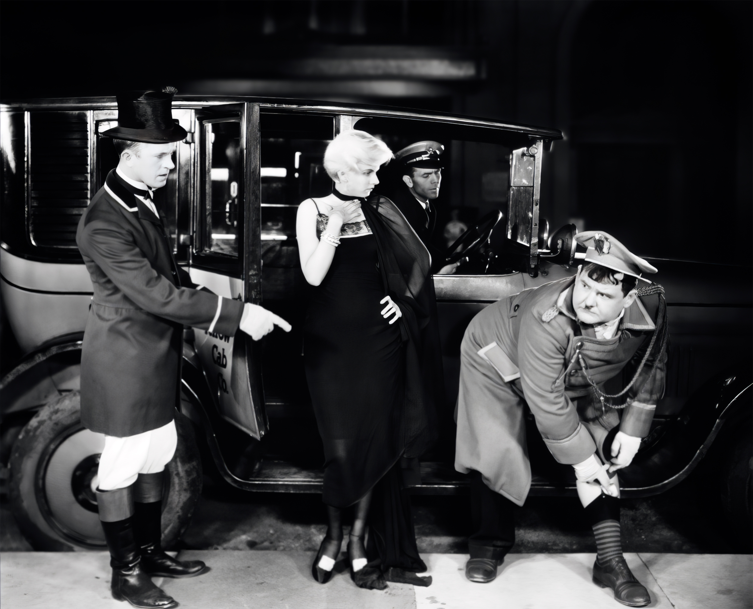 Because of the basic set-up—Hardy, a resplendently uniformed doorman a la Emil Jannings in The Last Laugh, overly-ingratiating to guests, trying to instill dignity for their new profession into Laurel, and at the same time keep him in his place as his own subordinate—there is an even wider field than usual for Hardy's pantomime of face and body, and he—and the gloriously lampooned Stroheim—tend to rather dominate Stan on this occasion.  Jean Harlow, looking sexy and attractive as a young lady whose skirt is ripped away accidentally by the mortified Hardy, is actually no more than a comedy prop, despite the "dressing" she gives to her short but memorable sequence.