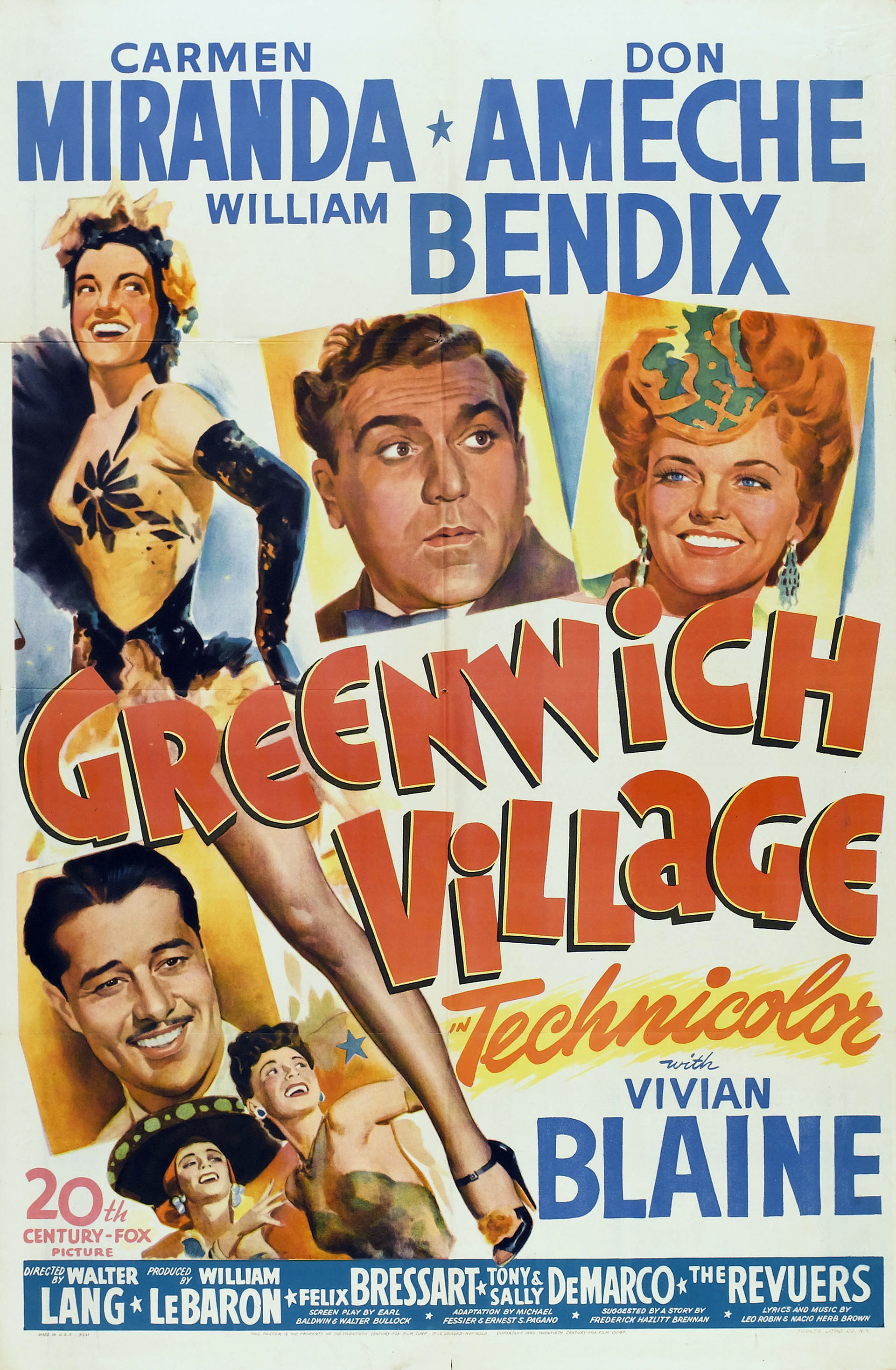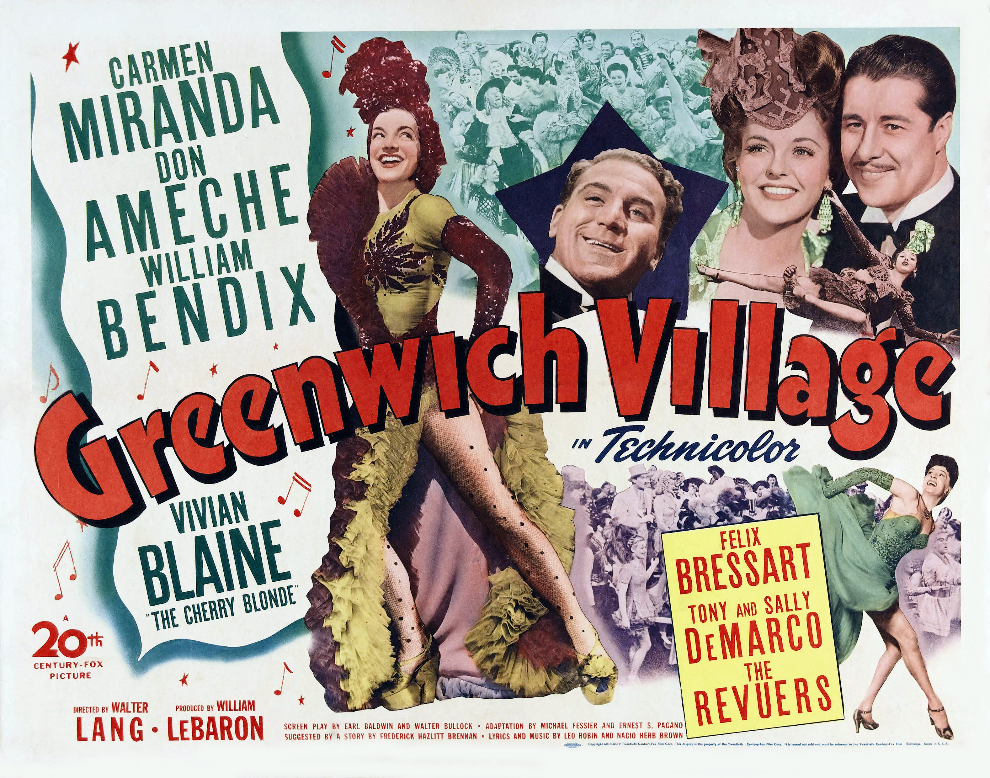 20th Century Fox, 1944. Directed by Walter Lang.  Camera:  Harry Jackson, Leon Shamroy.  With Carmen Miranda, Don Ameche, William Bendix, Vivian Blaine, Felix Bressart, Tony De Marco, Sally De Marco, The Revuers, B.S. Pulley, The Four Step Brothers, Emil Rameau, The Banda Da Lua, Frank Orth, Torben Meyer, Hal K. Dawson, William B. Davidson, Eddie Dunn, Sherry Hall, Tom Dugan, Billy Wayne, Charles Arnt, Oliver Prickett, Charles Williams, Robin Short, Dave Morris, Alfred Allegro, J. Farrell McDonald, Forbes Murray, Evelyn Mulhall.