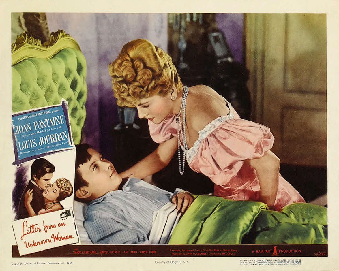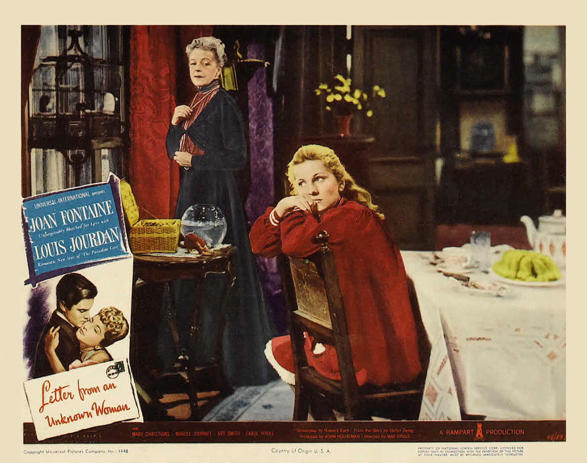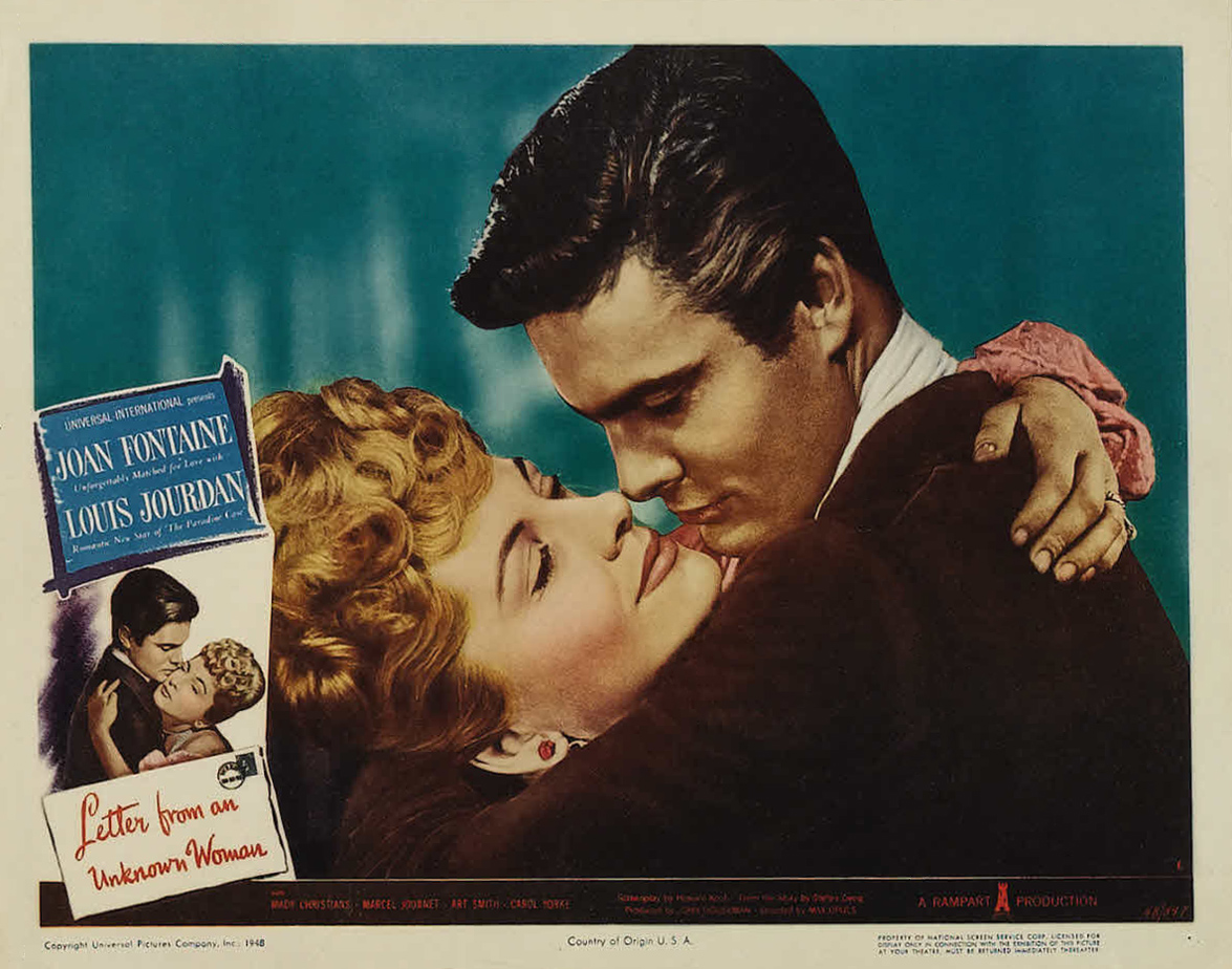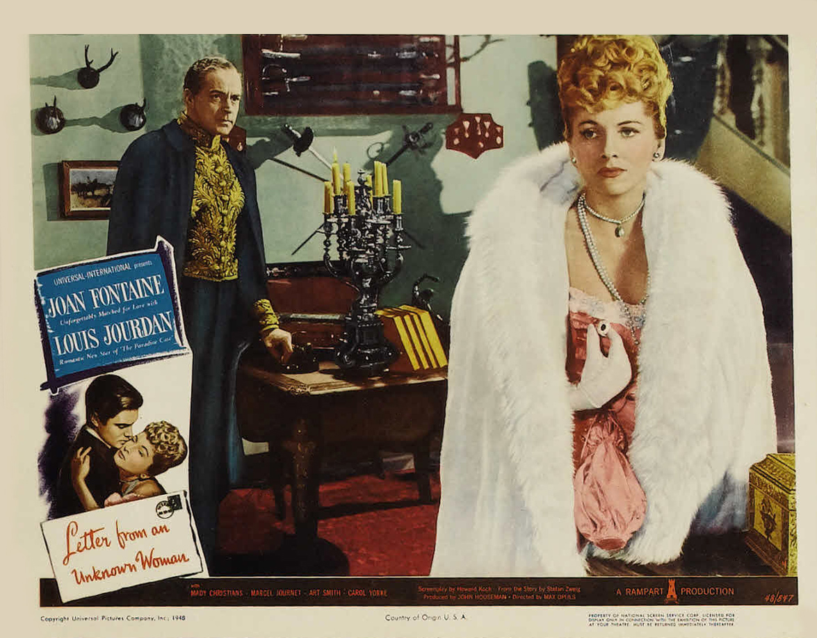 Universal, 1948.  Directed by Max Opuls.  Camera:  Frank Planer.  With Joan Fontaine, Louis Jourdan, Mady Christians, Marcel Journet, Art Smith, Carol Yorke, Howard Freeman, John Good, Leo B. Pessin, Erskine Sanford, Otto Waldis, Sonja Bryden, Patricia Alphin, William Trenk, Fred Nurney, Torben Meyer, Hermine Sterter, C. Ramsey Hill, Will Lee, William Hall.