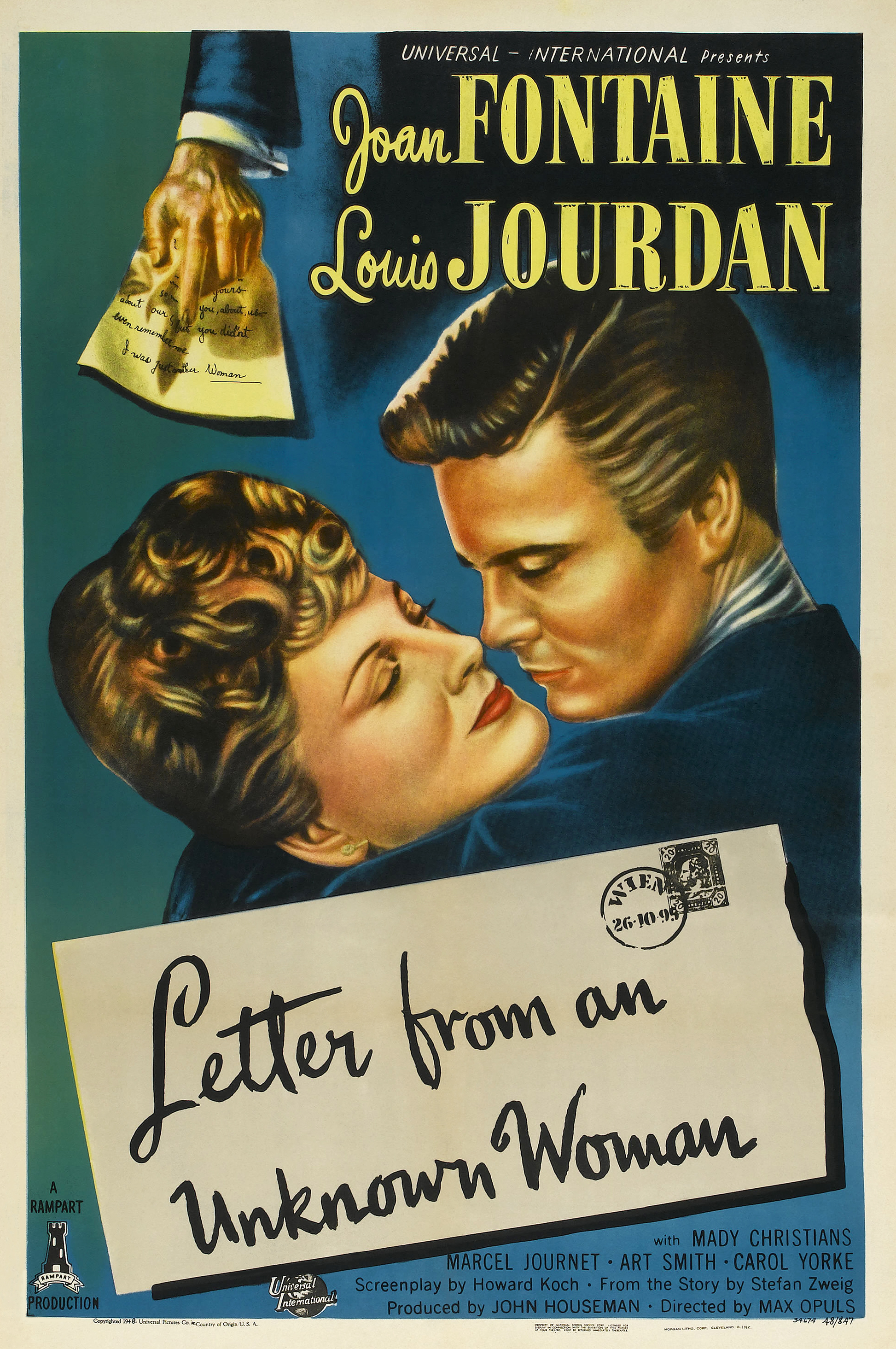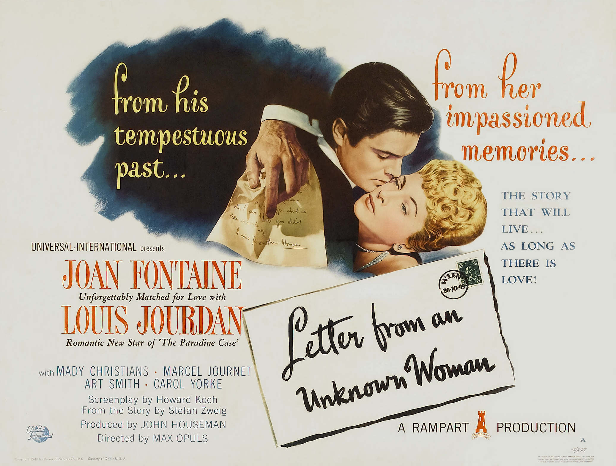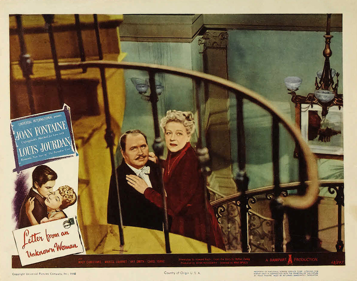 Universal, 1948.  Directed by Max Opuls.  Camera:  Frank Planer.  With Joan Fontaine, Louis Jourdan, Mady Christians, Marcel Journet, Art Smith, Carol Yorke, Howard Freeman, John Good, Leo B. Pessin, Erskine Sanford, Otto Waldis, Sonja Bryden, Patricia Alphin, William Trenk, Fred Nurney, Torben Meyer, Hermine Sterter, C. Ramsey Hill, Will Lee, William Hall.