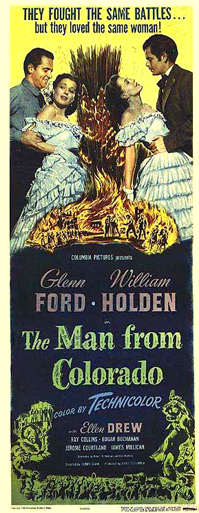 Columbia, 1948.  Directed by Henry Levin.  Camera:  William Snyder.  With Glenn Ford, William Holden, Ellen Drew, Ray Collins, Edgar Buchanan, Jerome Courtland, James Millican, Jim Bannon, William "Bill" Phillips, Denver Pyle, James Bush, Mikel Conrad, David Clarke, Ian MacDonald, Clarence Chase, Stanley Andrews, Myron Healey, Craig Reynolds, David York, Helen M. Gerehty.