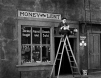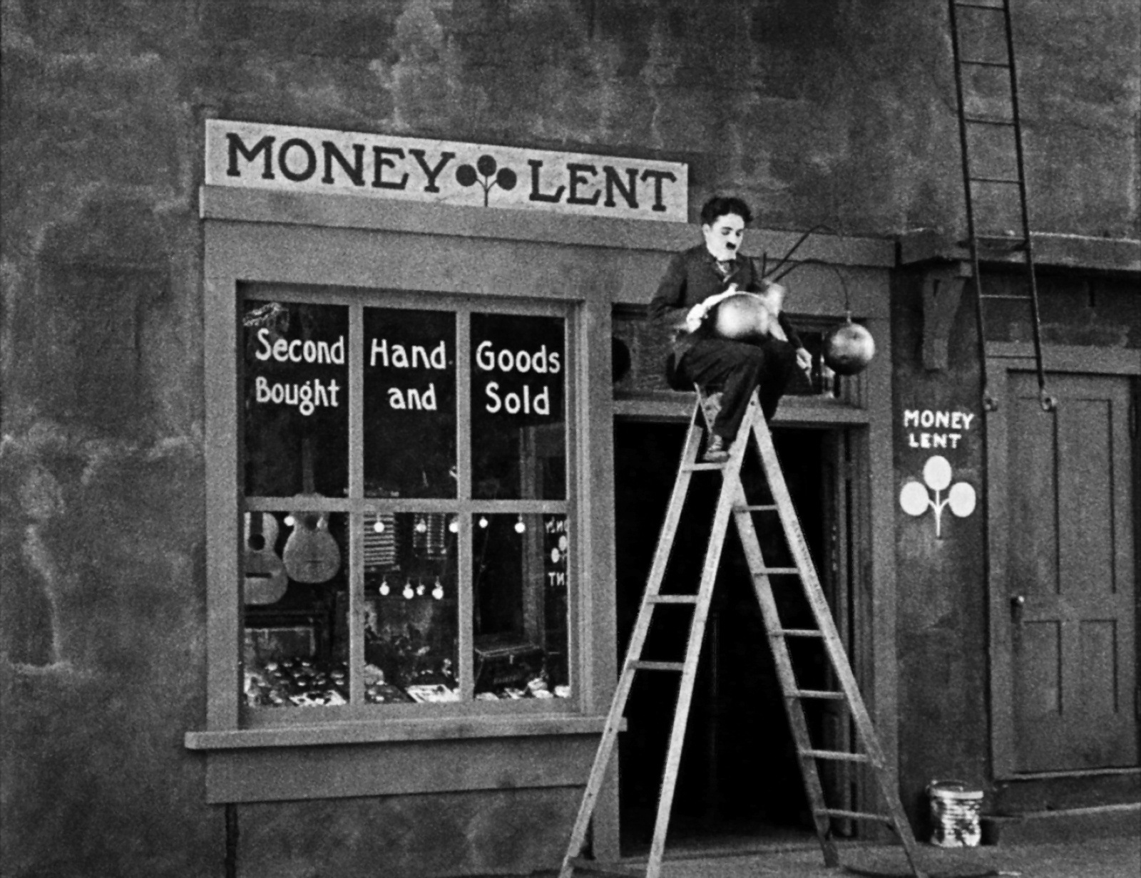 over a ladder they are using to polish the shop sign. The pawnbroker