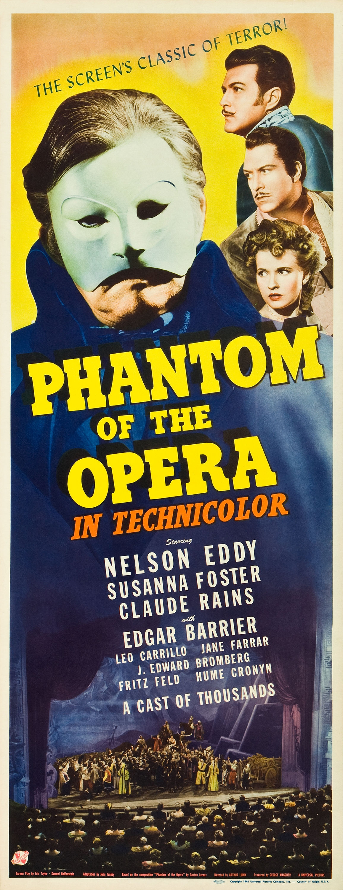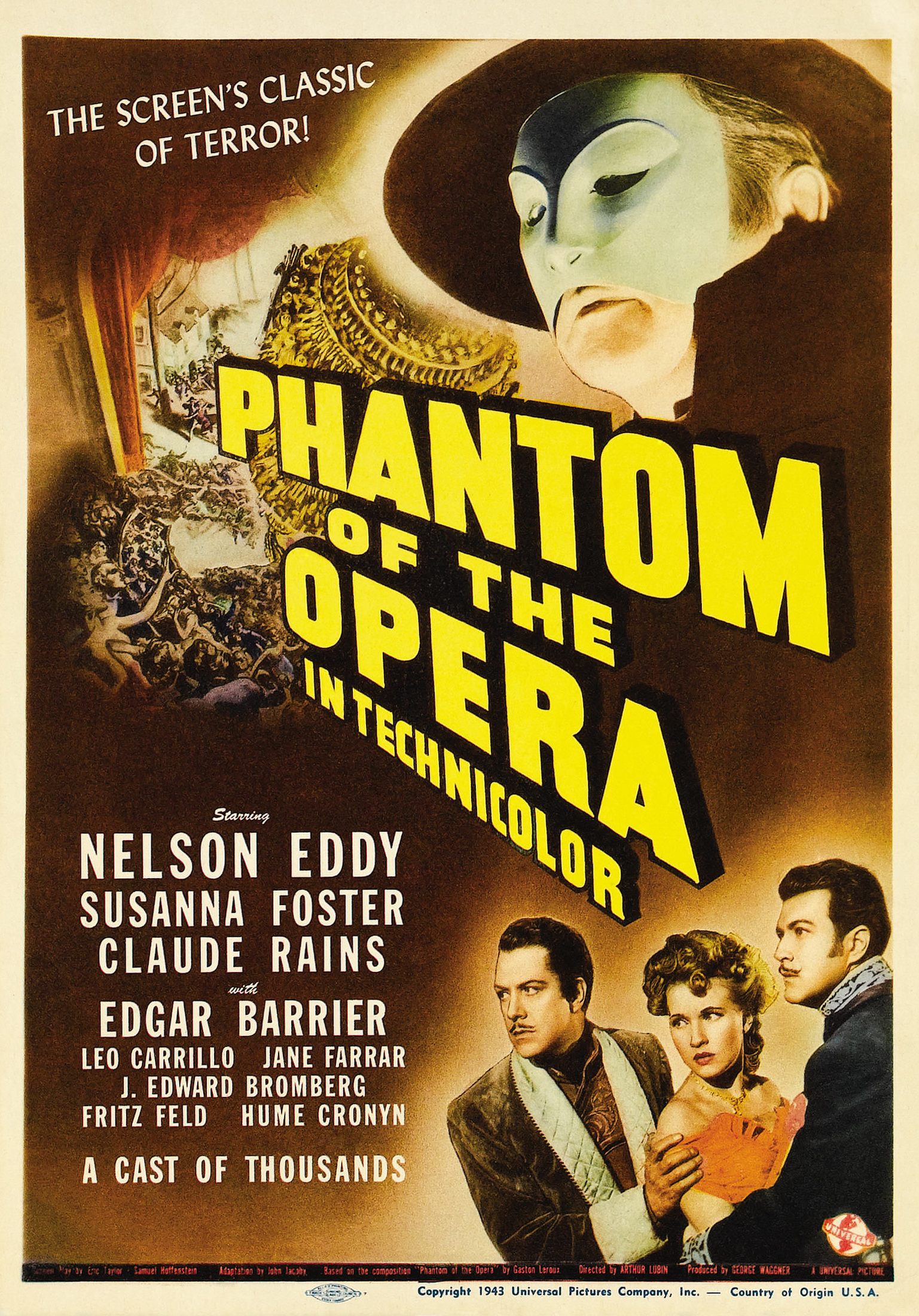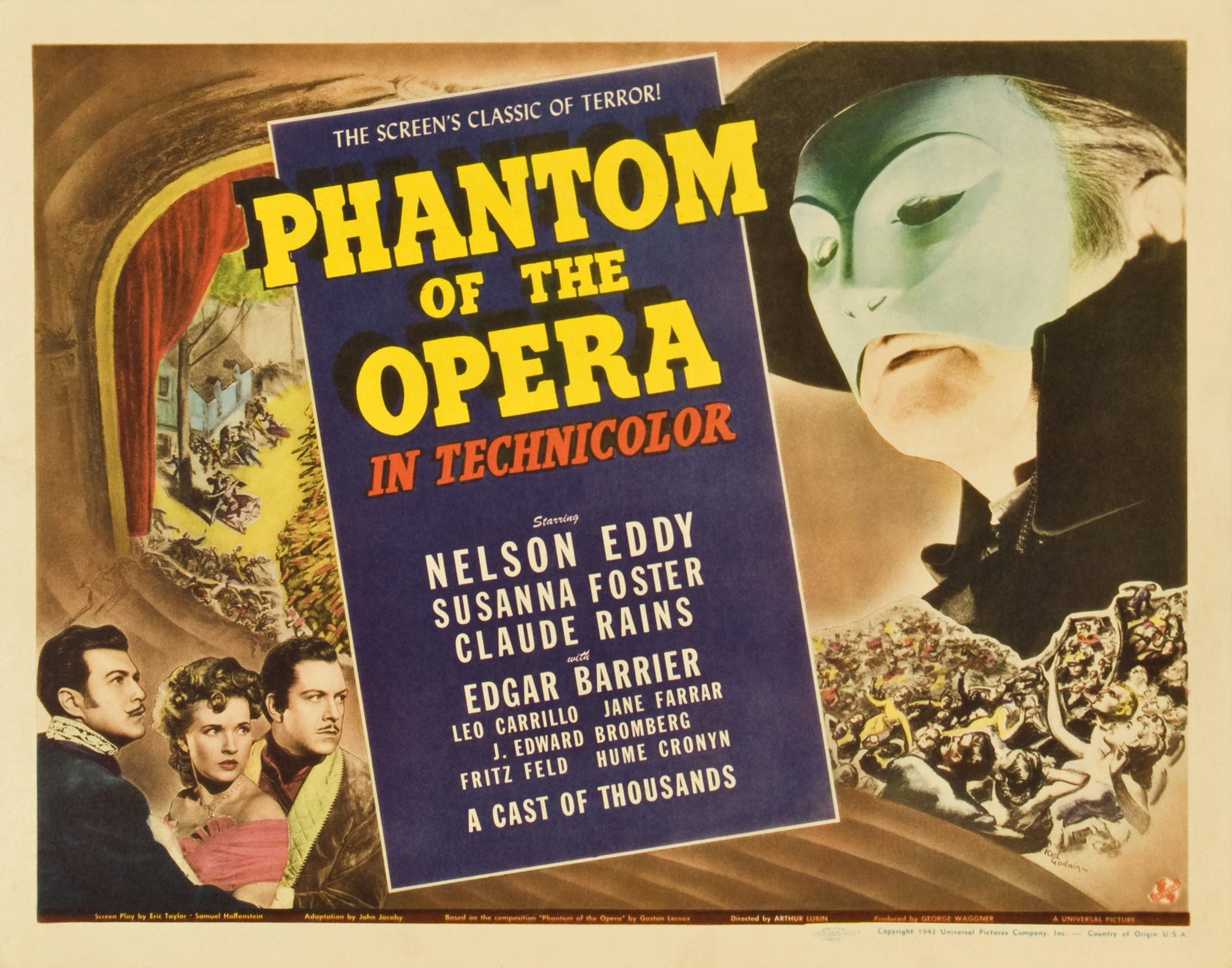 Universal, 1943.  Directed by Arthur Lubin.  Camera:  Hal Mohr.  With Nelson Eddy, Susanna Foster, Claude Rains, Edgar Barrier, Leo Carrillo, Jane Farrar, J. Edward Bromberg, Fritz Feld, Frank Puglia, Steven Geray, Barbara Everest, Hume Cronyn, Fritz Leiber, Nicki Andre, Gladys Blake, Elvira Curci, Hans Herbert, Kate Lawson, Miles Mander, Rosina Galli, Walter Stahl, Paul Marion, Beatrice Roberts, Marek Windheim.