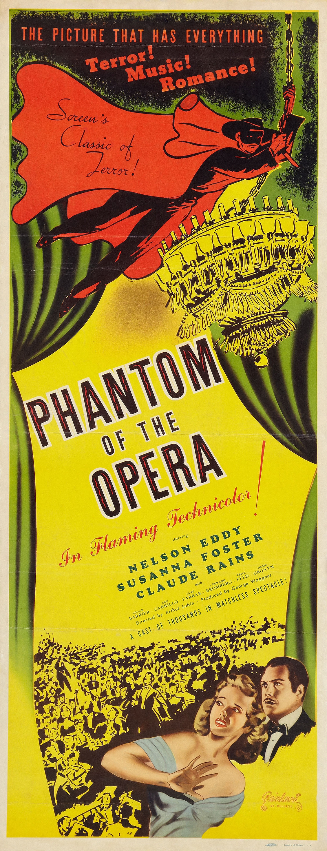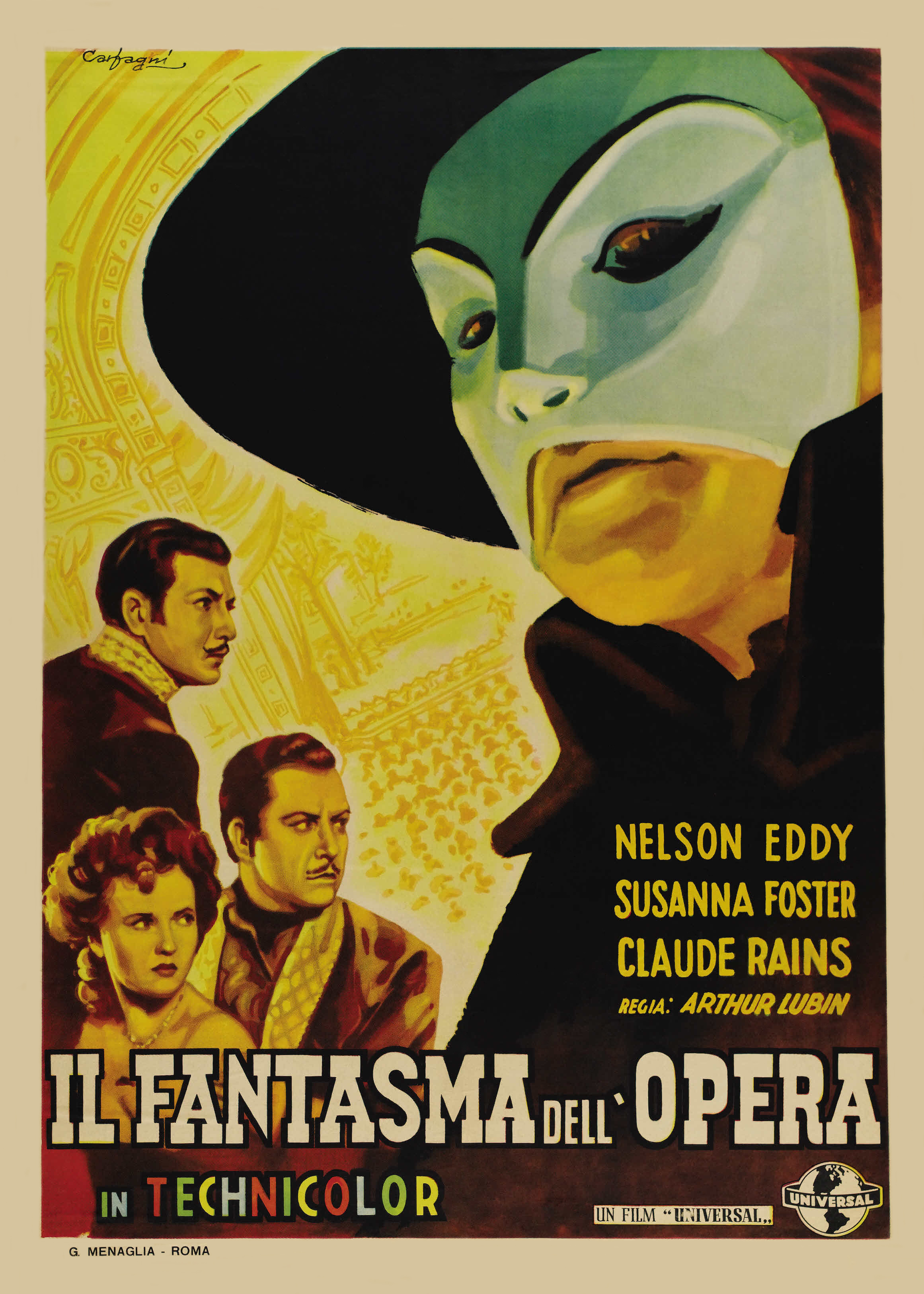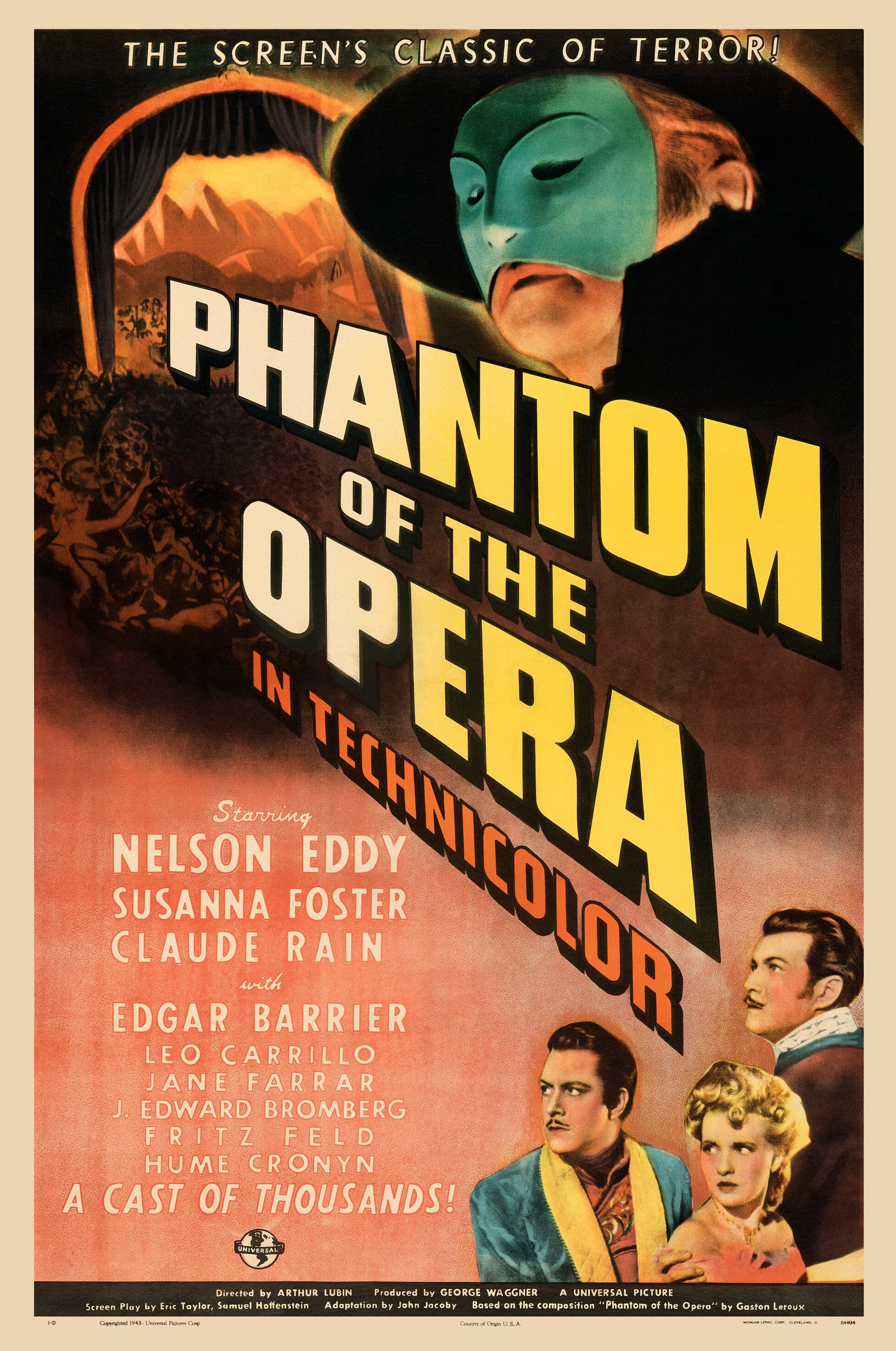 Universal, 1943.  Directed by Arthur Lubin.  Camera:  Hal Mohr.  With Nelson Eddy, Susanna Foster, Claude Rains, Edgar Barrier, Leo Carrillo, Jane Farrar, J. Edward Bromberg, Fritz Feld, Frank Puglia, Steven Geray, Barbara Everest, Hume Cronyn, Fritz Leiber, Nicki Andre, Gladys Blake, Elvira Curci, Hans Herbert, Kate Lawson, Miles Mander, Rosina Galli, Walter Stahl, Paul Marion, Beatrice Roberts, Marek Windheim.