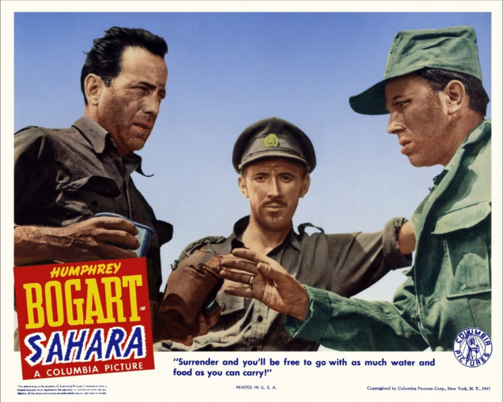 Columbia, 1943.  Directed by Zoltan Korda.  Camera:  Rudolph Maté.  With Humphrey Bogart, Bruce Bennett, J. Carrol Naish, Lloyd Bridges, Rex Ingram, Richard Nugent, Dan Duryea, Carl Harbord, Patrick O'Moore, Louis Mercier, Guy Kingsford, Kurt Krueger, John Wengraf, Hans Schumm, Vilmos Gymas, Frank Lackteen, Otto Reichow, Leyland Hodgson, George Neise, Jack Gardner, Leslie Denison.