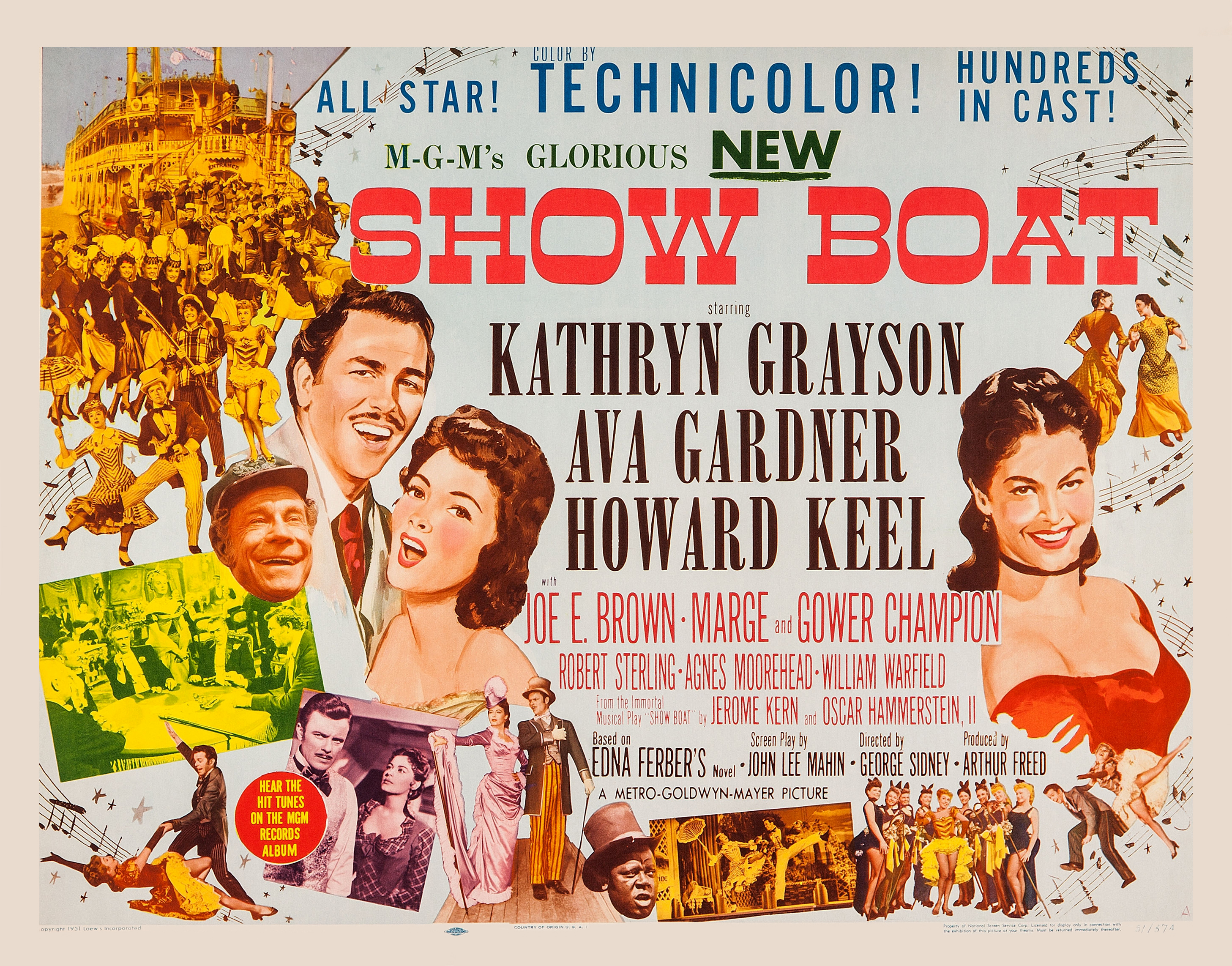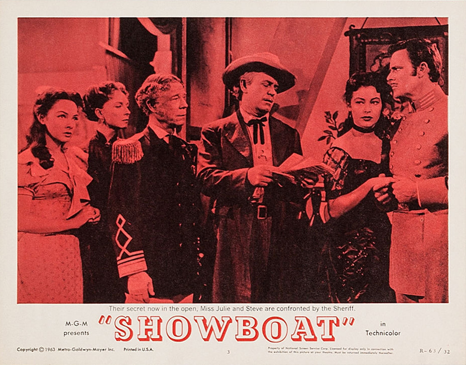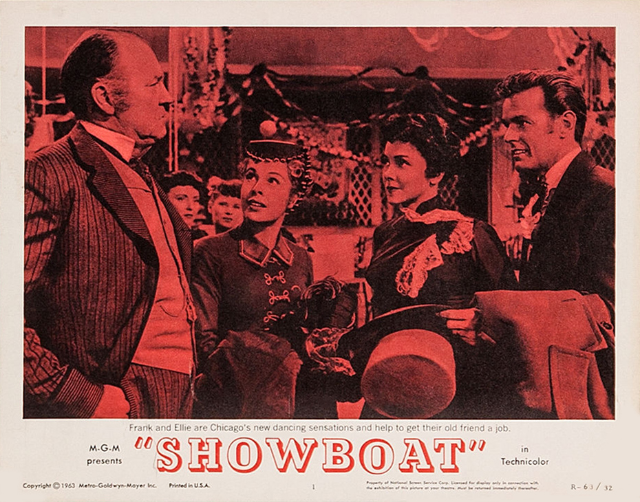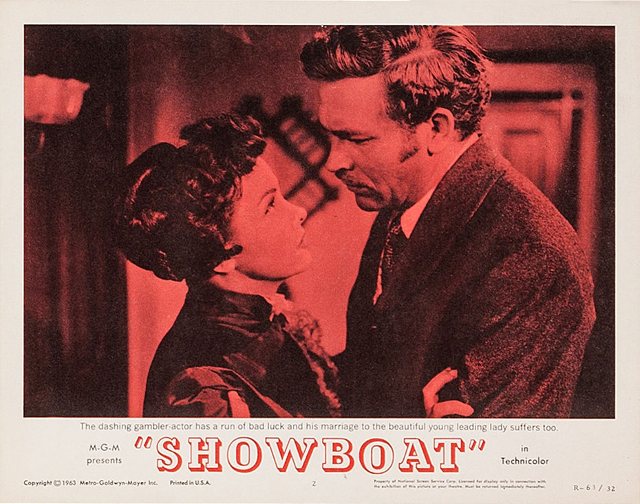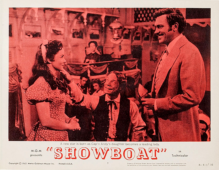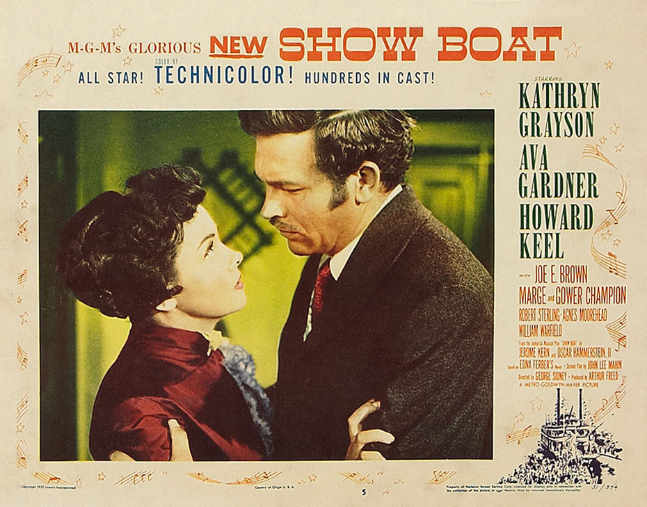 MGM, 1951.  Directed by George Sidney.  Camera:  Charles Rosher.  With Kathryn Grayson, Ava Gardner, Howard Keel, Joe E. Brown, Marge Champion, Gower Champion, Robert Sterling, Agnes Moorehead, Leif Erickson, William Warfield, Adele Jergens, Owen McGiveney, Frances Williams, Regis Toomey, Frank Wilcox, Chick Chandler, Emory Parnell, Sheila Clark, Ian MacDonald.