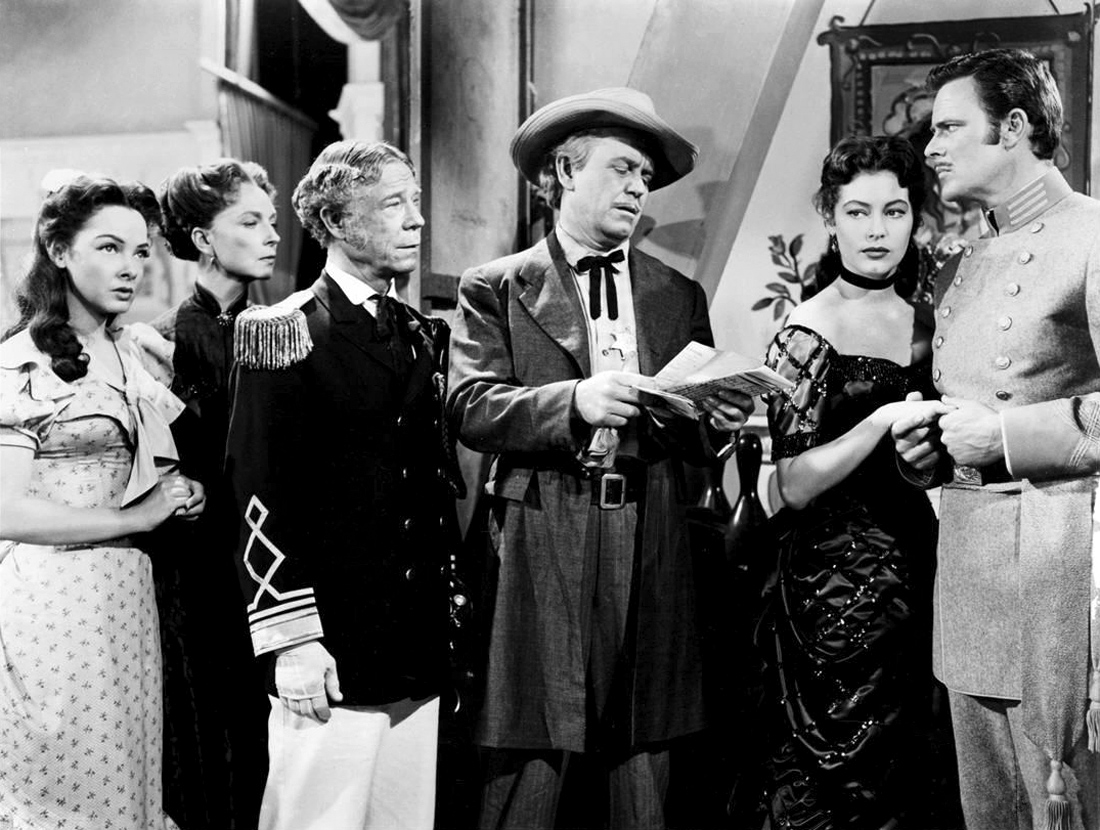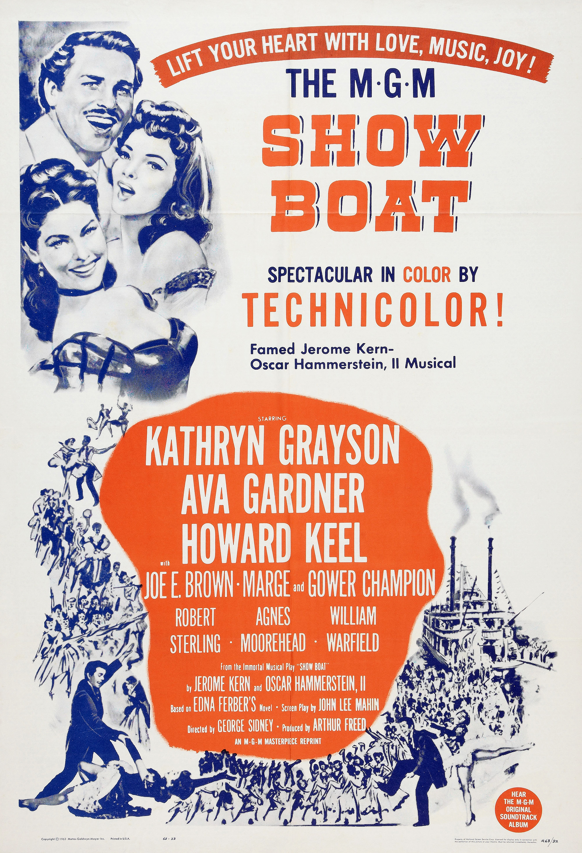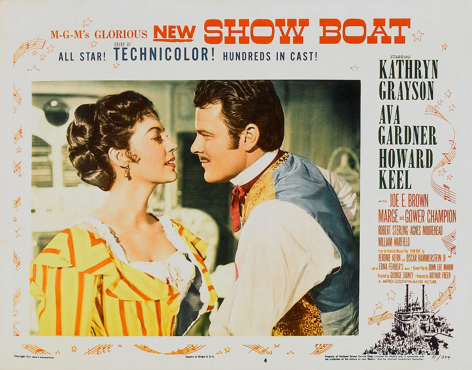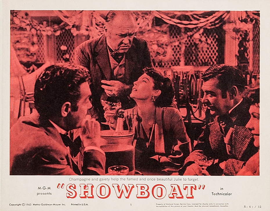 MGM, 1951.  Directed by George Sidney.  Camera:  Charles Rosher.  With Kathryn Grayson, Ava Gardner, Howard Keel, Joe E. Brown, Marge Champion, Gower Champion, Robert Sterling, Agnes Moorehead, Leif Erickson, William Warfield, Adele Jergens, Owen McGiveney, Frances Williams, Regis Toomey, Frank Wilcox, Chick Chandler, Emory Parnell, Sheila Clark, Ian MacDonald.