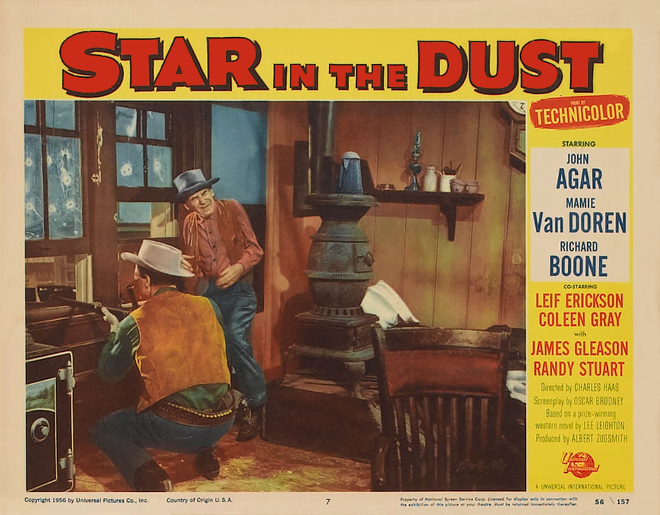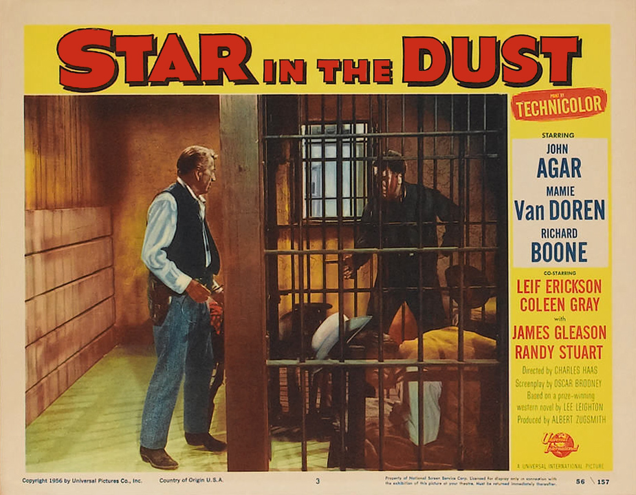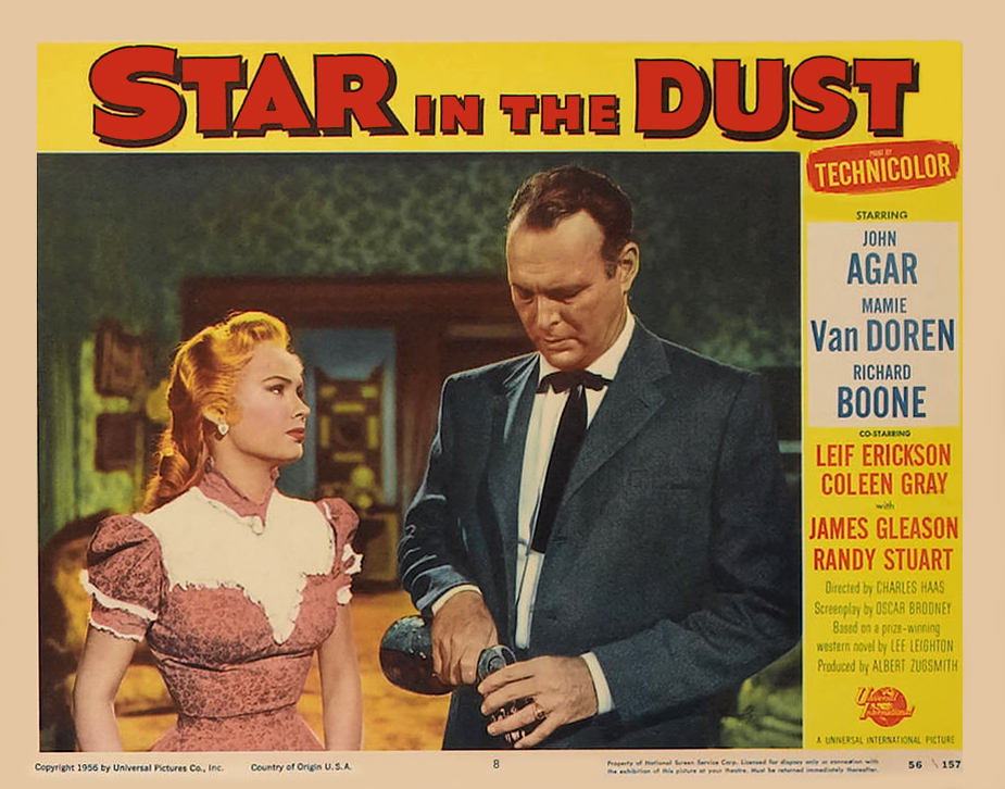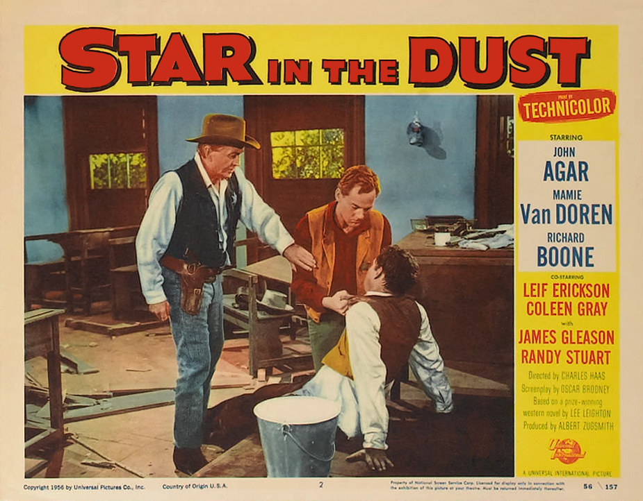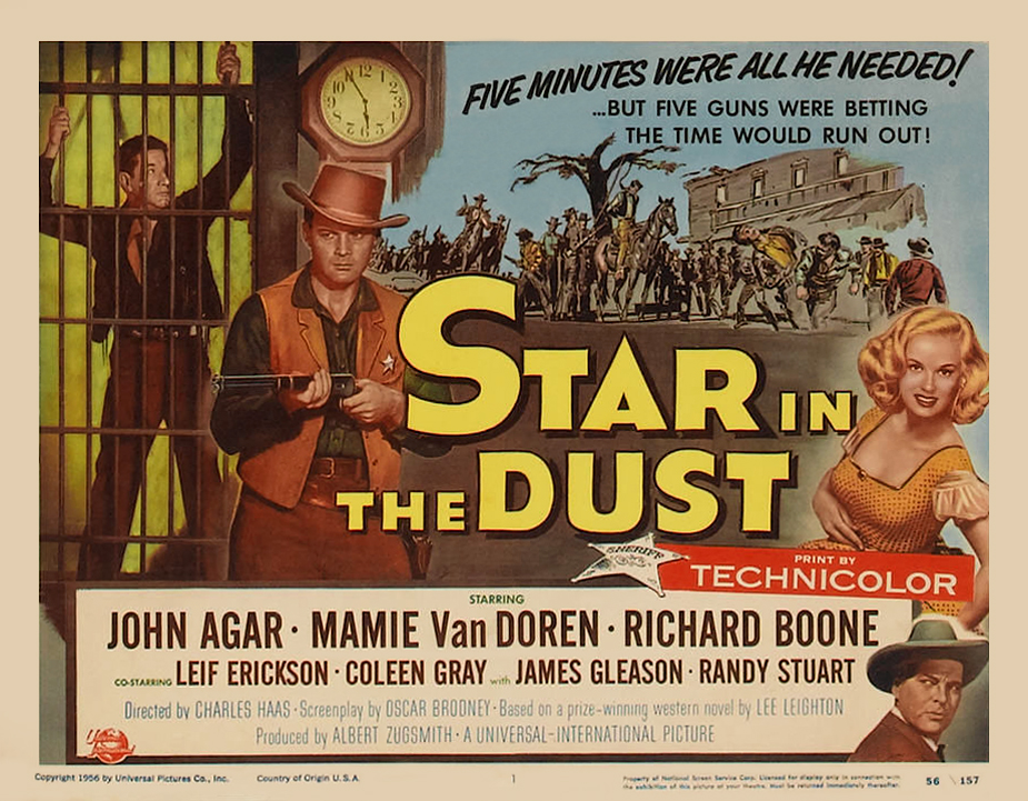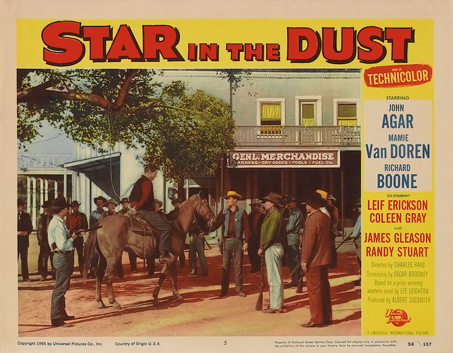 Universal, 1956.  Directed by Charles Haas.  Camera:  John L. Russell, Jr.  With John Agar, Mamie Van Doren, Richard Boone, Coleen Gray, Leif Erickson, James Gleason, Randy Stuart, Terry Gilkyson, Paul Fix, Harry Morgan, Stuart Randall, Robert Osterloh, Stanley Andrews, John Day, Stafford Repp, Lewis Martin, Renny McEvoy, Jesse Kirkpatrick, James Parnell, Clint Eastwood.