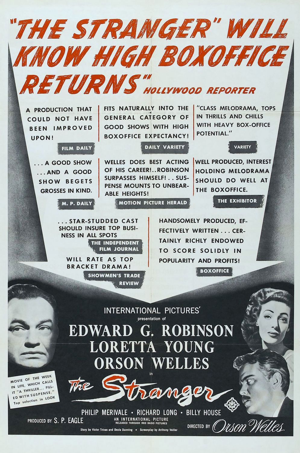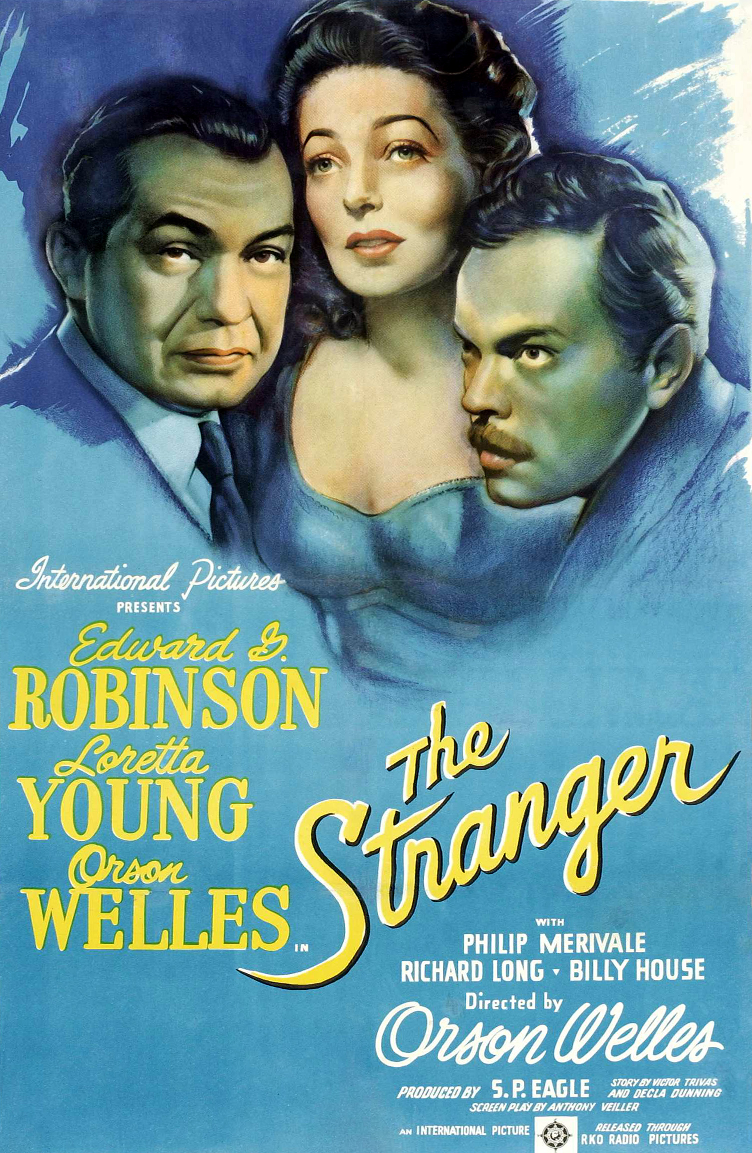 RKO, 1946.  Directed by Orson Welles.  Camera:  Russell Metty.  With Edward G. Robinson, Loretta Young, Orson Welles, Philip Merivale, Richard Long.
