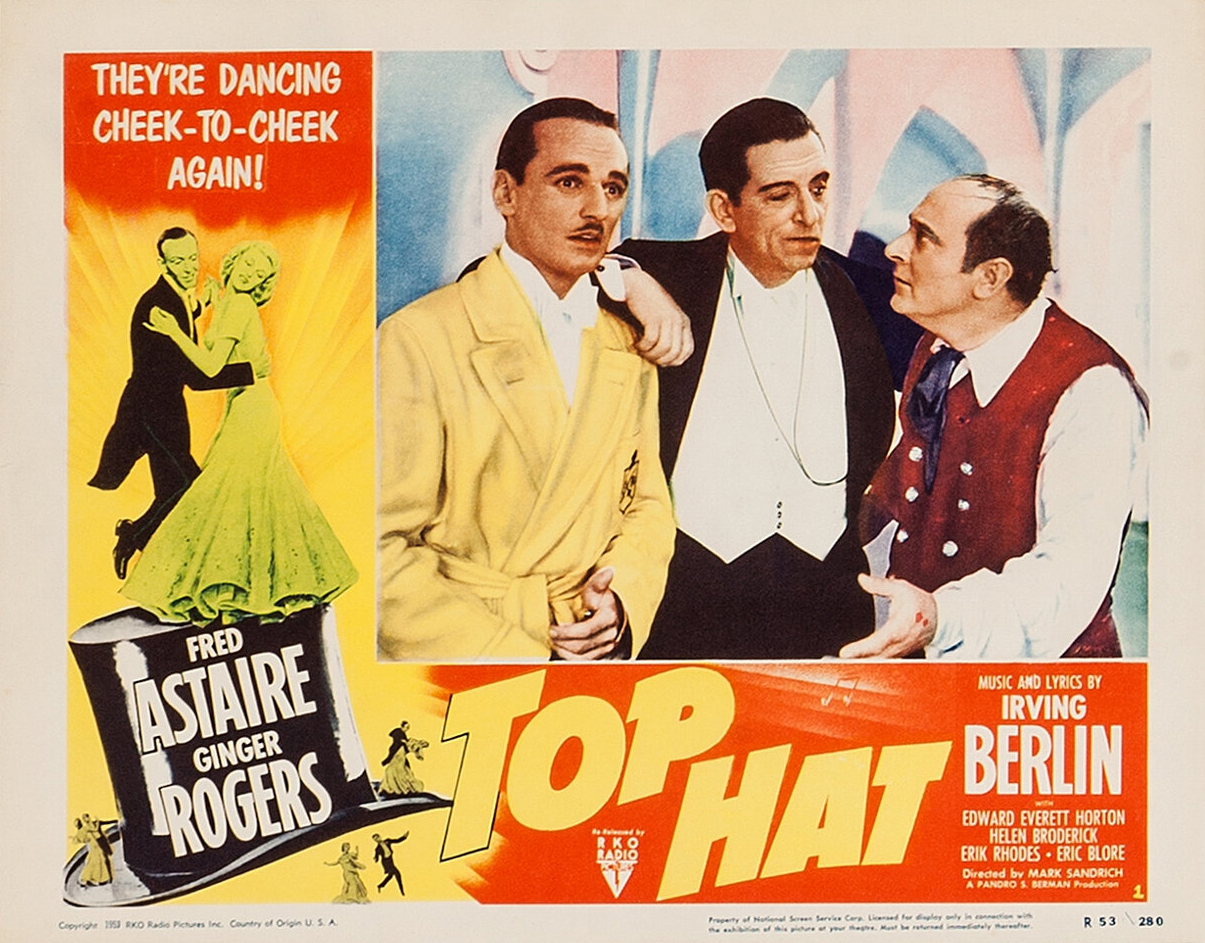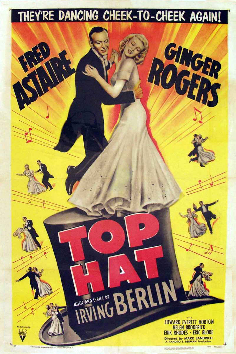 RKO Radio Pictures, 1935.  Directed by Mark Sandrich.  Camera:  David Abel.  With Ginger Rogers, Fred Astaire, Edward Everett Horton, Erik Rhodes, Eric Blore, Helen Broderick, Donald Meek, Florence Roberts, Gino Corrado, Peter Hobbes, Leonard Mudie, Lucille Ball, Robert Adair, Bud Flanagan, Ben Holmes, Nick Thompson, Tom Costello, John Impolite, Genaro Spagnoli, Rita Rozelle, Phyllis Coghlan, Charles Hall, Anya Taranda, Henry Mowbray, Tom Ricketts, Tom Brandon, Roy Brent, Tito Blasco, Rosette Rosalie.