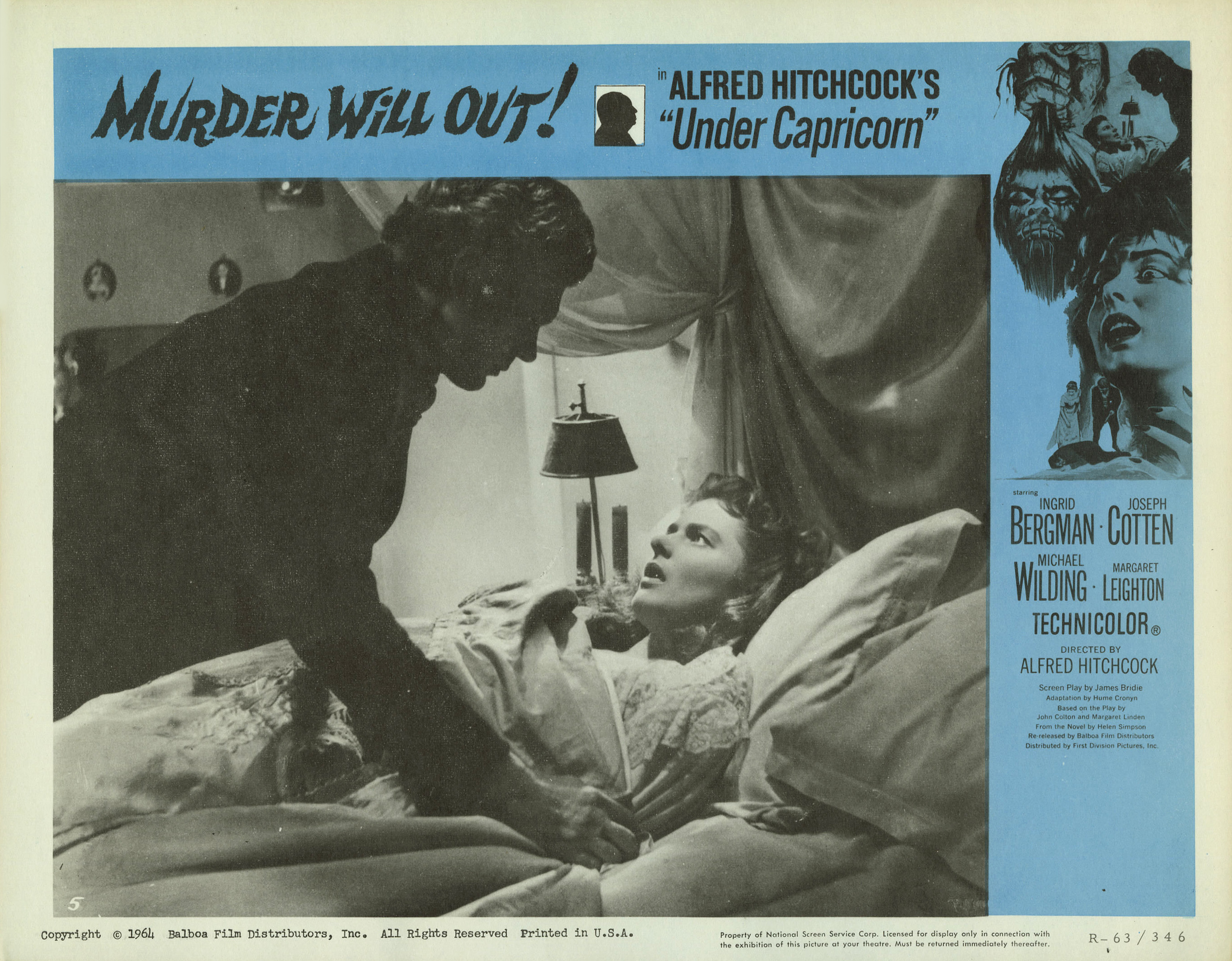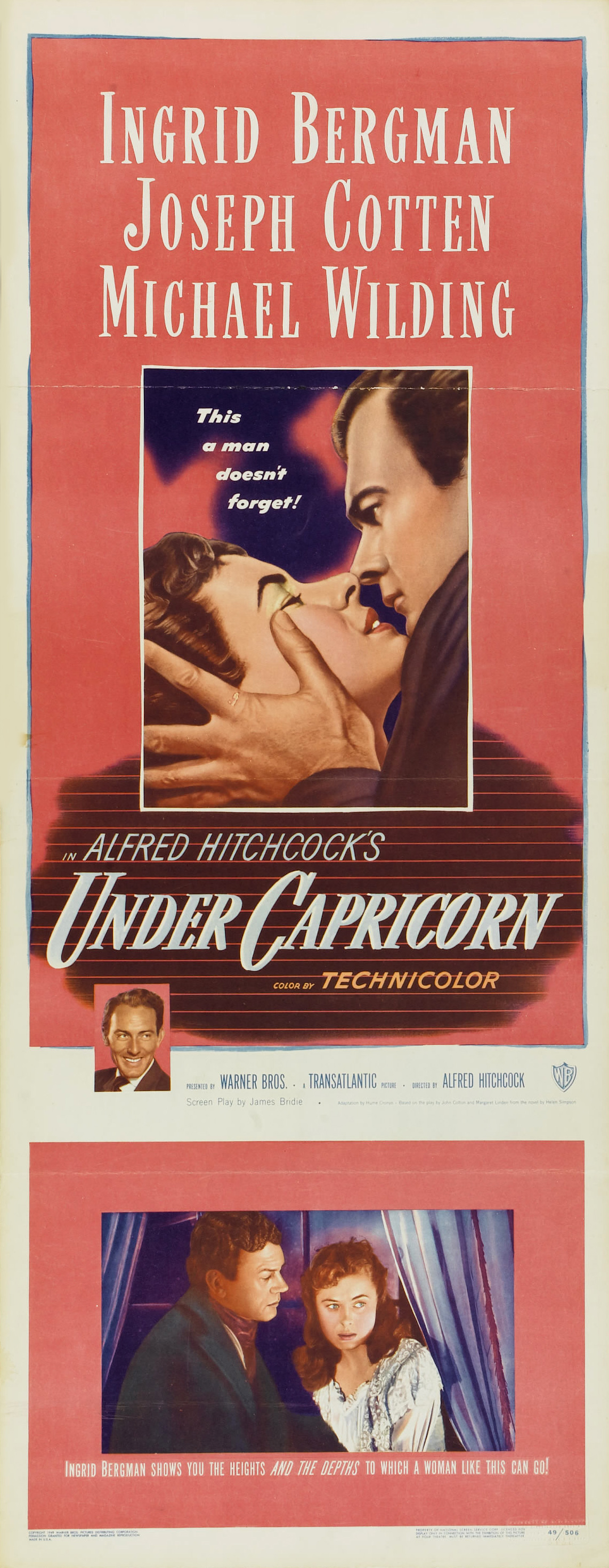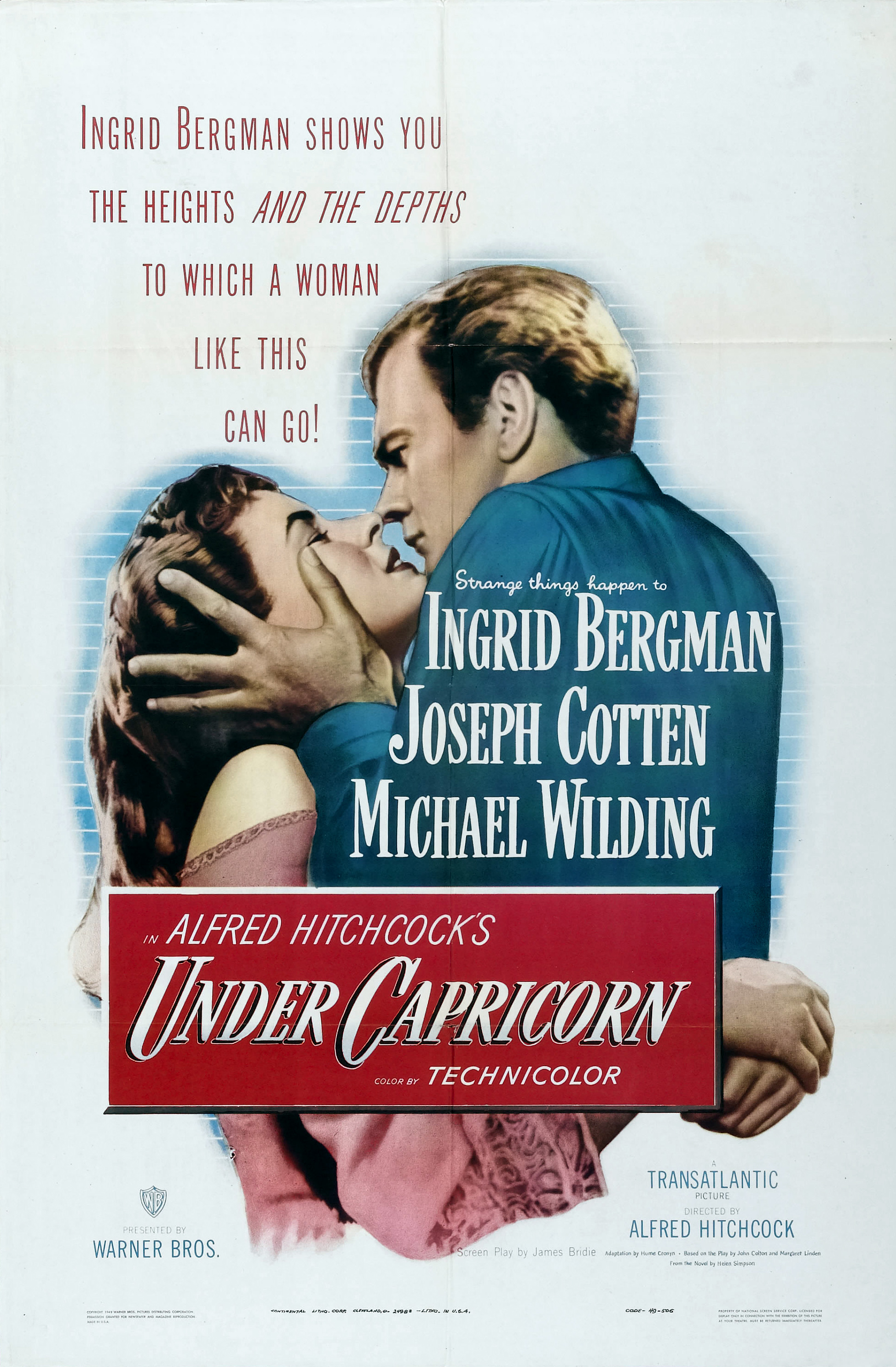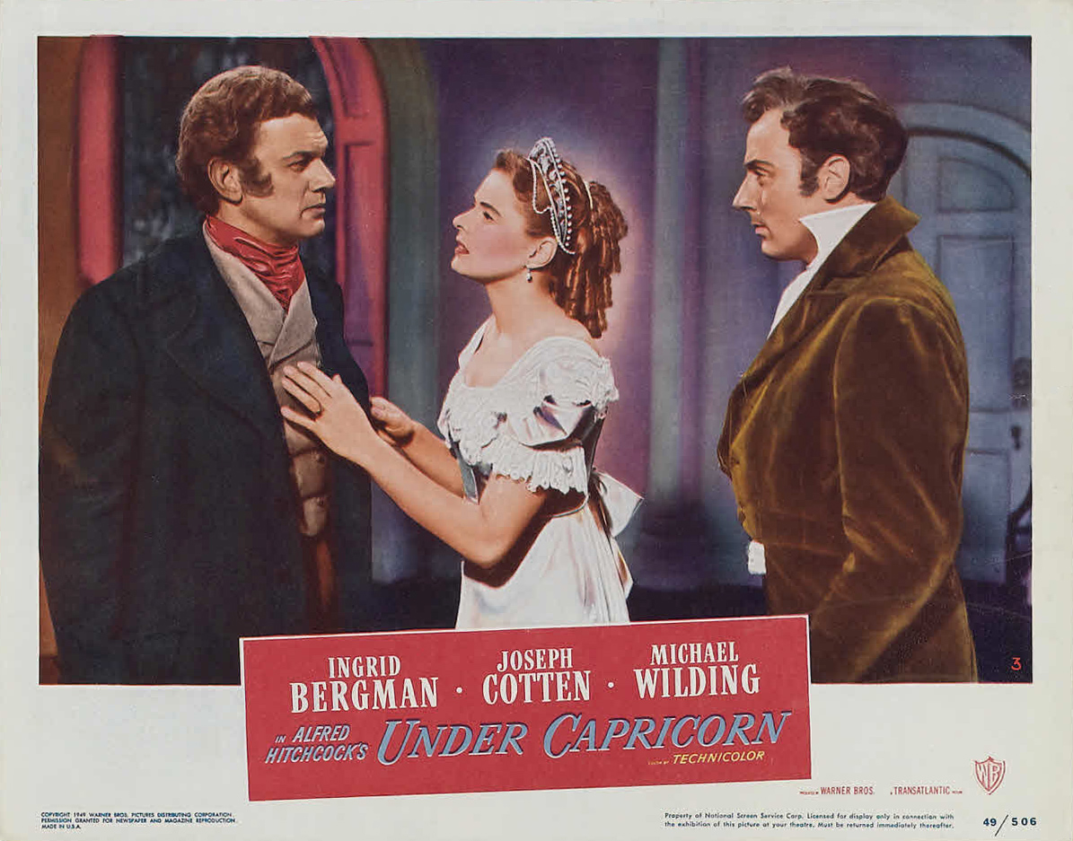 Warner Bros., 1949.  Directed by Alfred Hitchcock.  Camera:  Jack Cardiff.  With Ingrid Bergman, Joseph Cotten, Michael Wilding, Margaret Leighton, Cecil Parker, Denis O'Dea, Jack Watling, Harcourt Williams, John Ruddock, Bill Shine, Victor Lucas, Ronald Adam, Francis De Wolff, G.H. Mulcastor, Olive Sloane, Maureen Delaney, Julia Lang, Betty McDermott, Alfred Hitchcock.
