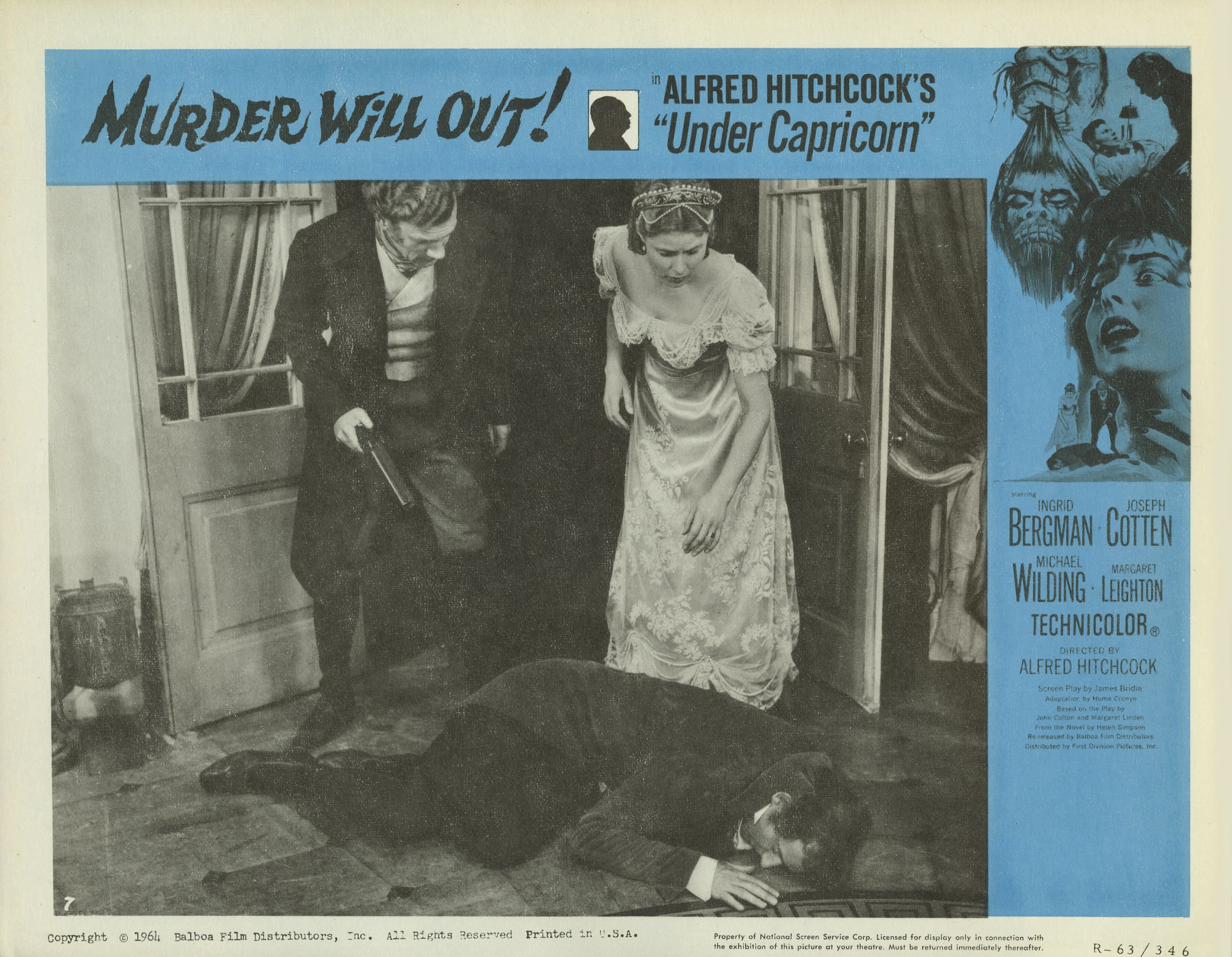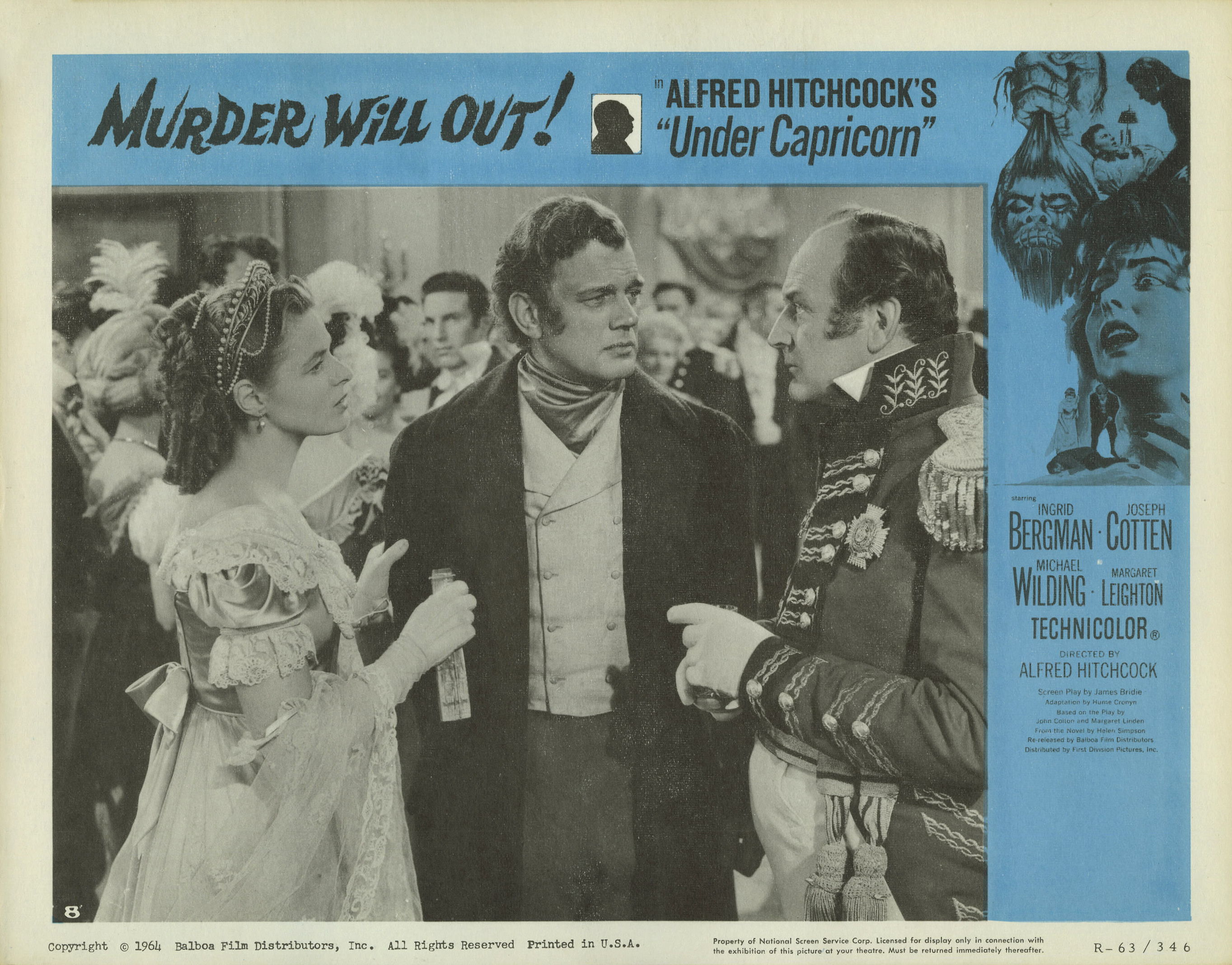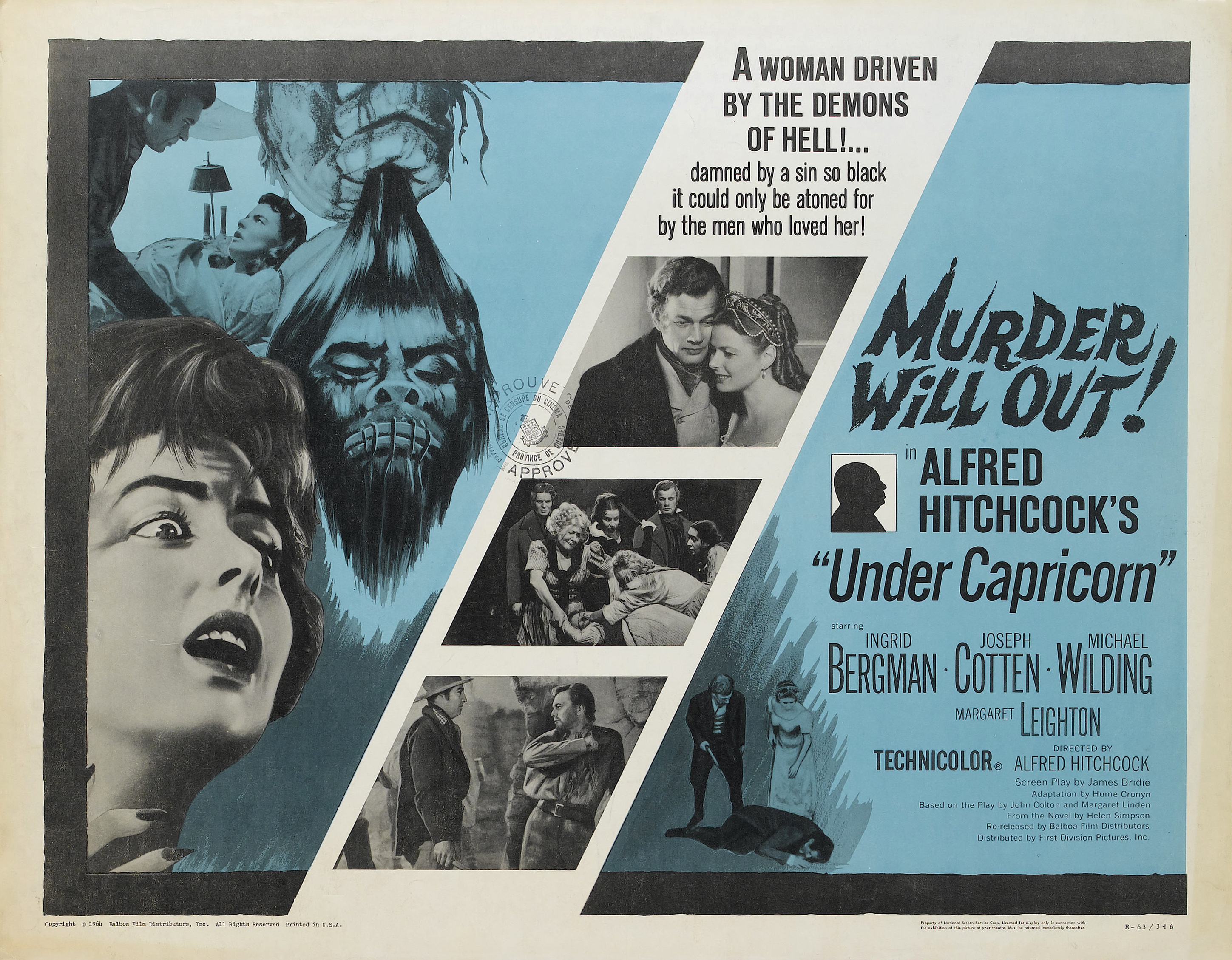 Warner Bros., 1949.  Directed by Alfred Hitchcock.  Camera:  Jack Cardiff.  With Ingrid Bergman, Joseph Cotten, Michael Wilding, Margaret Leighton, Cecil Parker, Denis O'Dea, Jack Watling, Harcourt Williams, John Ruddock, Bill Shine, Victor Lucas, Ronald Adam, Francis De Wolff, G.H. Mulcastor, Olive Sloane, Maureen Delaney, Julia Lang, Betty McDermott, Alfred Hitchcock.