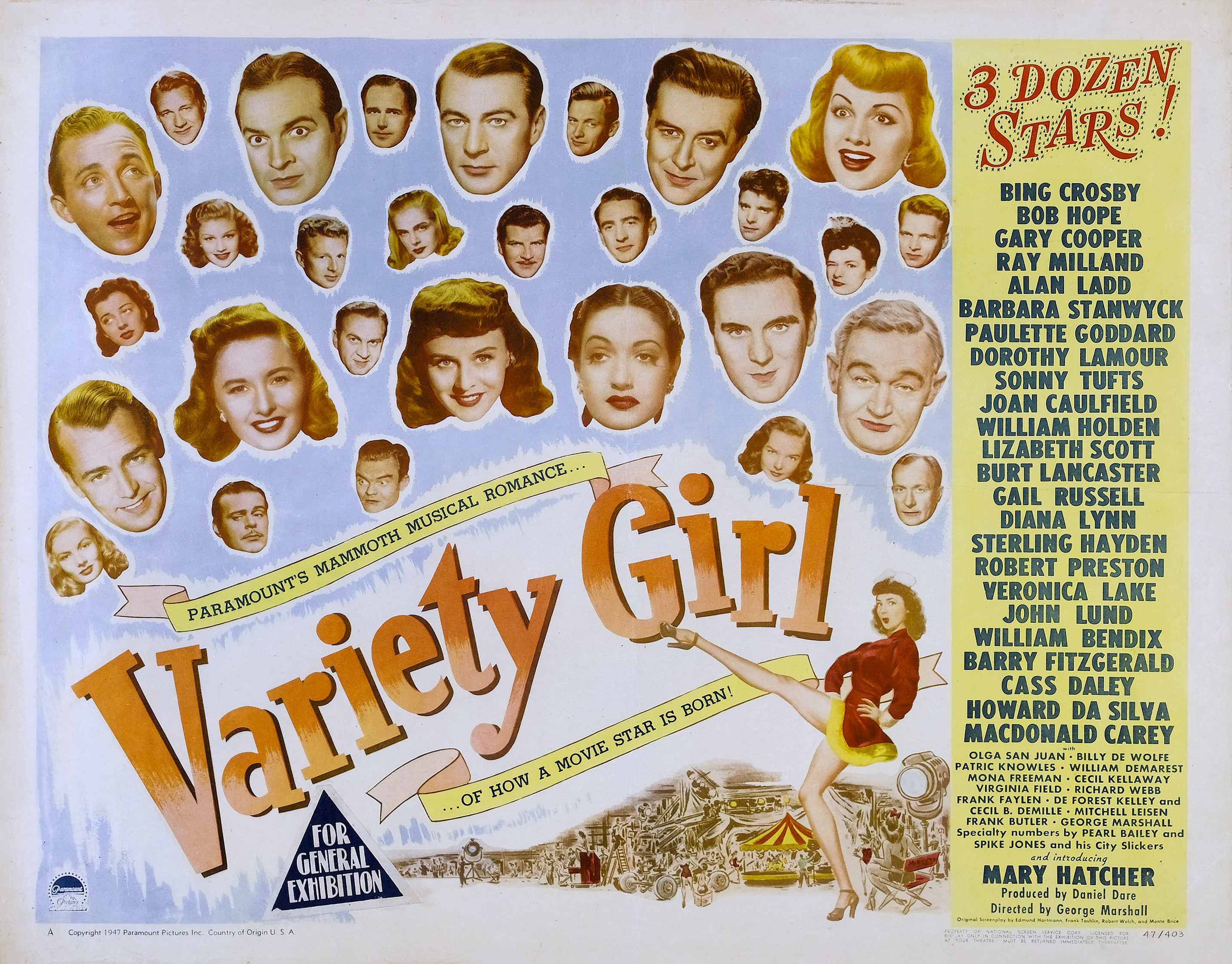 Paramount, 1947.  Directed by George Marshall.  Camera:  Lionel Lindon.  With Mary Hatcher, Olga San Juan, DeForest Kelly, Frank Ferguson, Glen Tryon, Nella Walker, Torben Meyer, Jack Norton, Elaine Riley, Charles Victor, Gus Taute, Harry Hayden, Bing Crosby, Bob Hope, Gary Cooper, Ray Milland, Alan Ladd, Barbara Stanwyck, Paulette Goddard, Dorothy Lamour, Sonny Tufts, William Holden, Joan Caulfield, Lizabeth Scott, Burt Lancaster, Gail Russell, Diana Lynn, Sterling Hayden, Robert Preston, Veronica Lake, John Lund, William Bendix, Barry Fitzgerald, Howard Da Silva, Macdonald Carey, Cass Daley, Patric Knowles, Billy De Wolfe, Mona Freeman, William Demarest, Cecil Kellaway, Virginia Field, Richard Webb, Frank Faylen, Cecil B. DeMille.