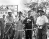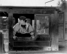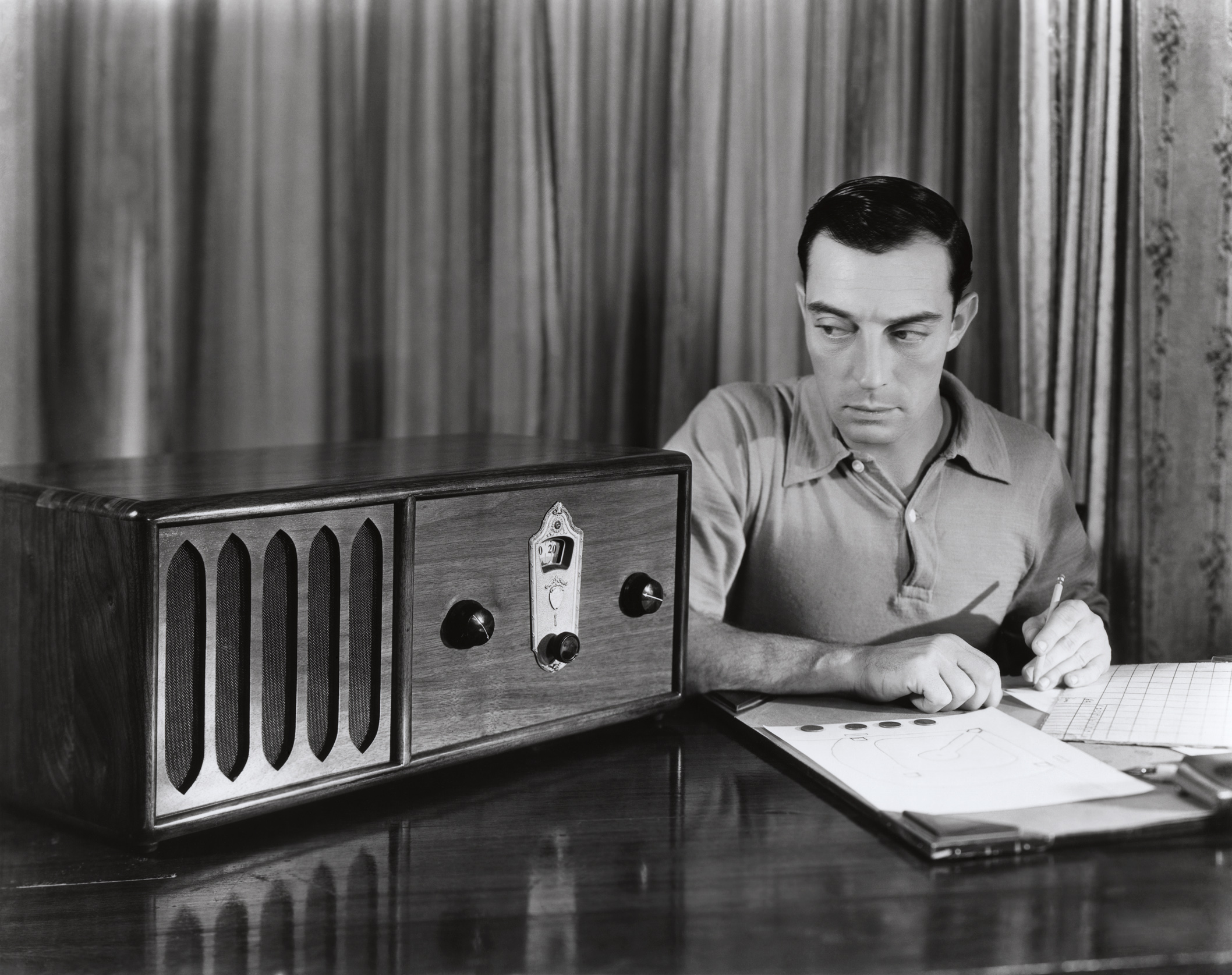 We start off with a photo of Buster Keaton dreaming up new gags in his trailer during the filming of Spite MarriageKeaton has drawn a baseball diamond and the "form" to his left is a home-made scoring sheet.  The coins are to mark base runners as players reach base.  He is listening to a game on the radio while scoring the game play-by-play.  Thanks to Bob for providing this information!