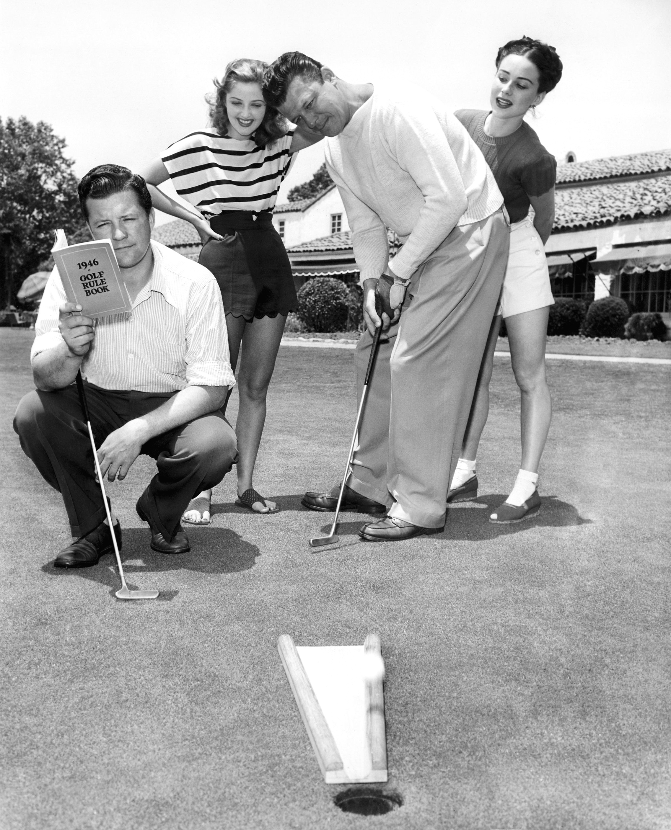 Next, say hello to Martha Vickers. We have three shots of the pretty actress, including two with Jack Carson and Dennis Morgan out on the golf course.