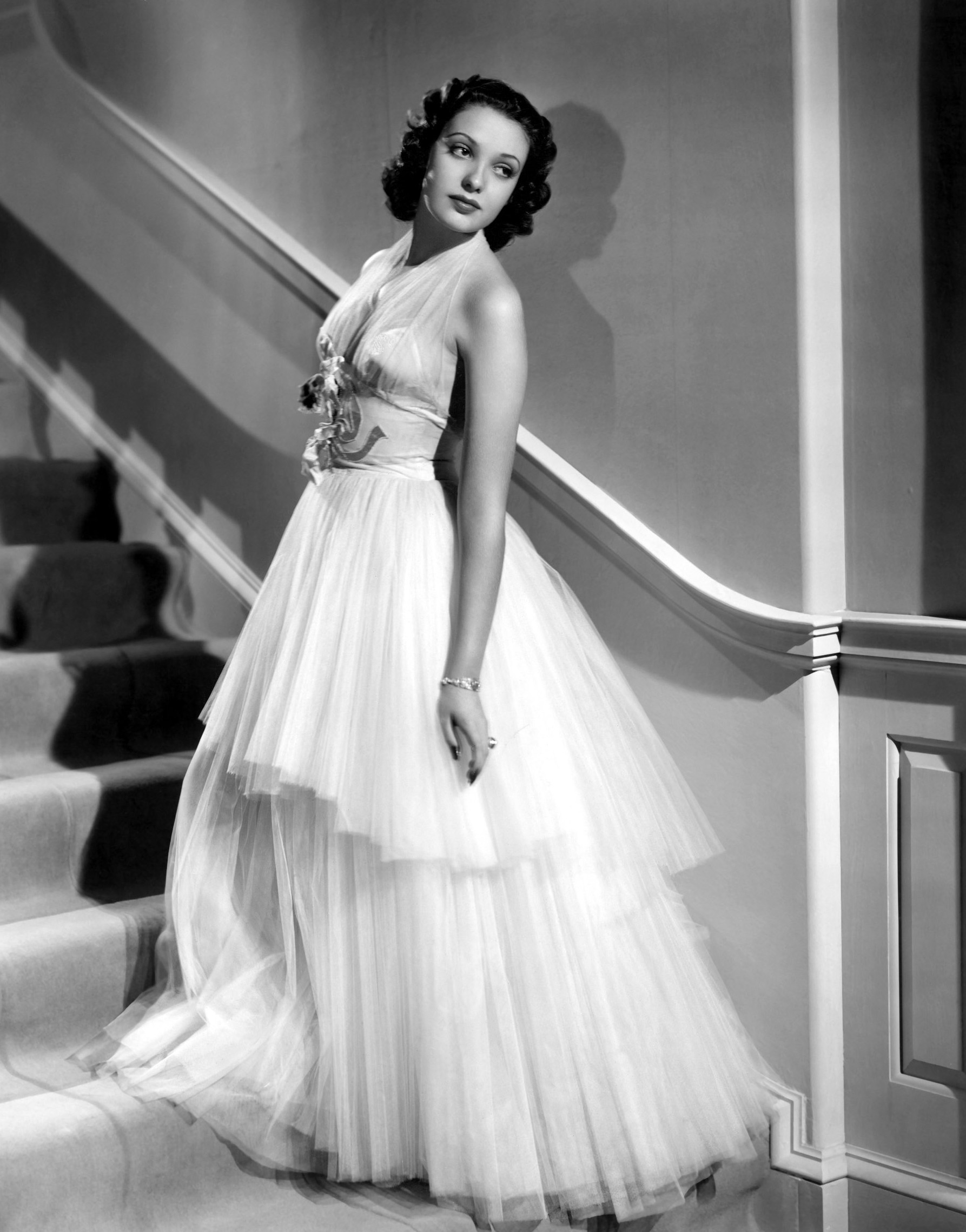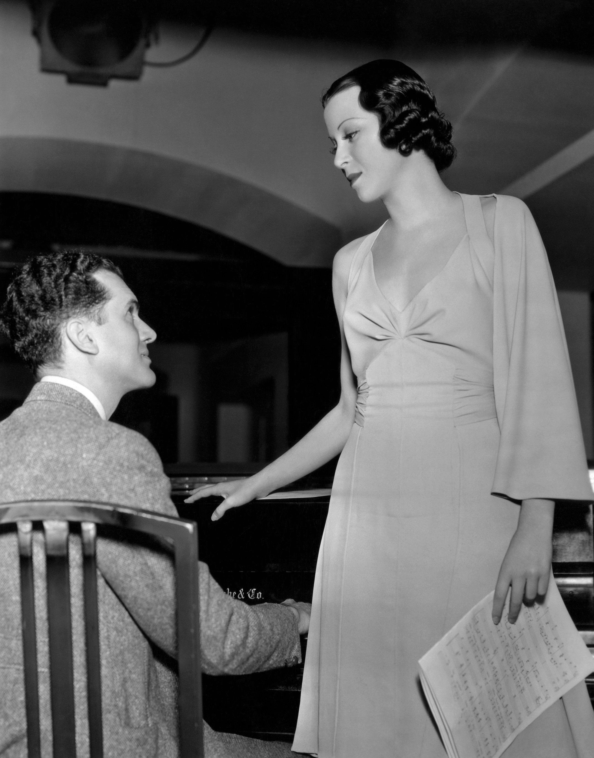 Kitty Carlisle consults Ralph Rainger in this photo from Diana.  She added a bonus scan of Linda Darnell about to join a dinner dance in Day-time Wife (1939).